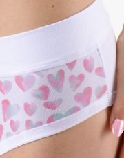 Majtki biodrowe z szerszym bokiem i szerszym pasem, szyta bielizna damska. Pas wykończony jest szerszym pasem z tego samego materiału. Majtki wykończone są wąskim pasem z tego samego materiału. Przód jest nadrukowany. Tył i pas są w jednolitym kolorze.