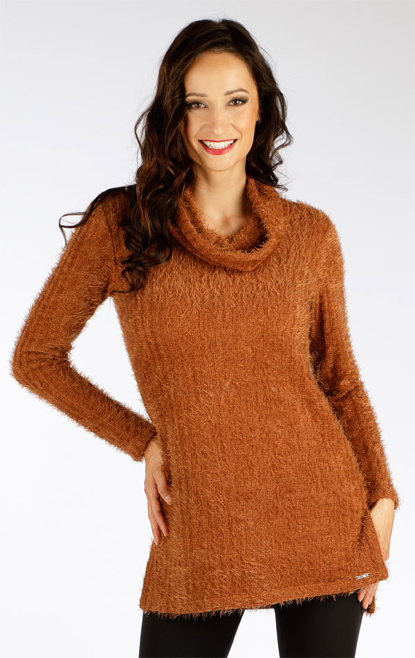 Wysoki kołnierz. Dłuższy tył. Rozcięcia po bokach. Oryginalny wygląd dzianiny z plastycznym wzorem i miękkim, przyjemnym w dotyku materiałem.