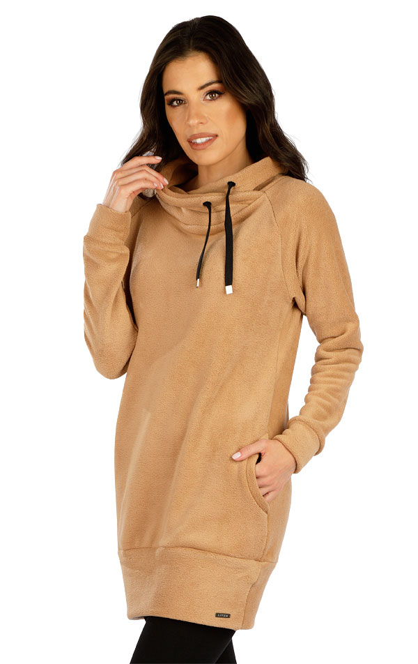Damska sukienka dresowa. Stójka z przelotkami i sznurkiem z ozdobnymi zakończeniami. Praktyczne kieszenie boczne. Długość rękawów i sukienki do mankietu. Oryginalny wygląd polaru „miś” jest bardzo elastyczny, ciepły i przyjemny w noszeniu. Długość sukienki ok. 80 cm.