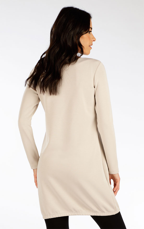 Prosty krój sukienki bez kieszeni, z lekkim marszczeniem na gumce na całej długości. Okrągły, gładki dekolt i ozdobna aplikacja z przodu. Luksusowy, elastyczny materiał z przyjemnym meszkiem od wewnątrz. Gładki, jedwabisty w dotyku i ciepły materiał zapewniają pełen komfort noszenia.