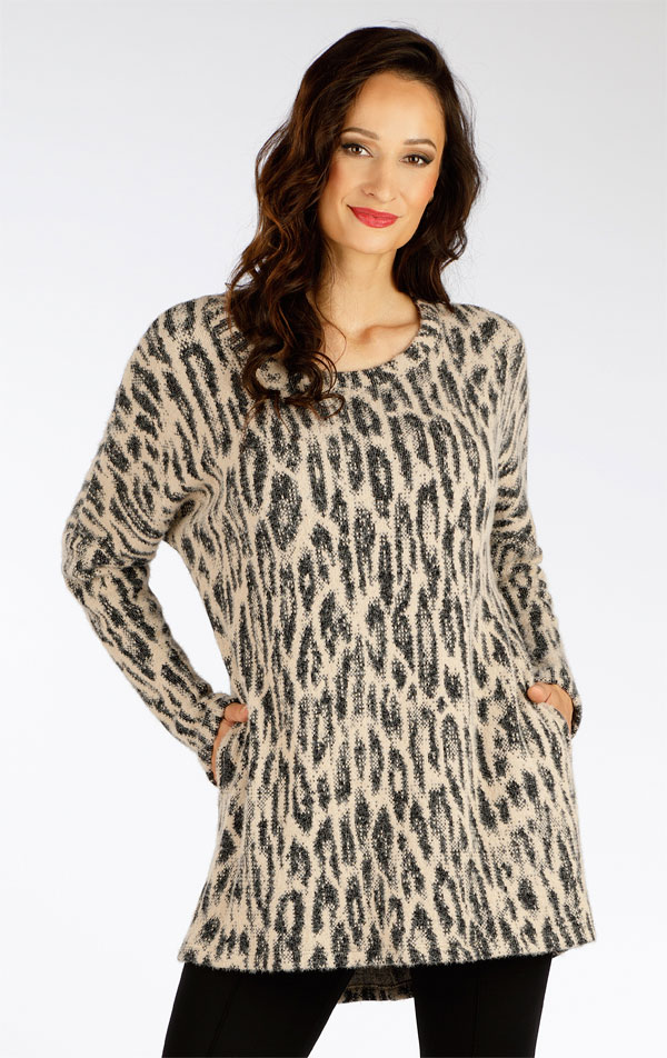 Luźny krój z okrągłym dekoltem i dłuższym tyłem. Praktyczne kieszenie boczne. Grubsza dzianina ze wzorem zwierzęcym jest elastyczna i przyjemna w dotyku. Oryginalna tunika, która zapewni ciepło i jest praktyczna w utrzymaniu. Długość tuniki ok. 85 cm.