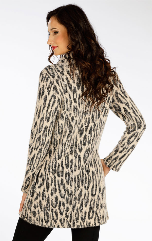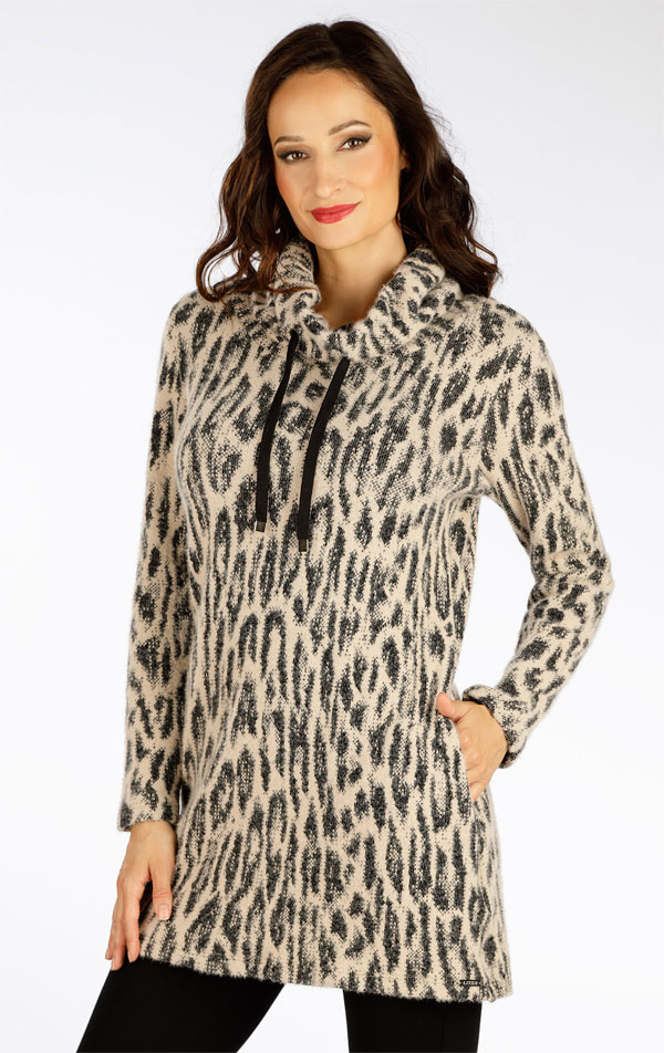 Wysoka stójka z przelotkami i sznurkiem ze srebrnymi wykończeniami. Praktyczne kieszenie boczne. Grubsza dzianina ze wzorem zwierzęcym jest elastyczna i przyjemna w dotyku. Oryginalna tunika, która zapewni ciepło i jest praktyczna w utrzymaniu.