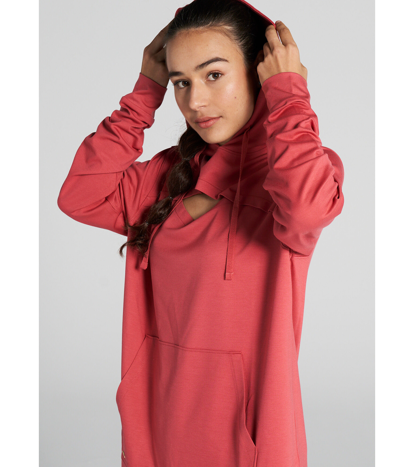 Damska bluza fitness z kapturem. Długa, z rozcięciem przy dekolcie i bocznymi obszyciami zapewnia maksymalną swobodę ruchu. Miękka, ciepła i wygodna.