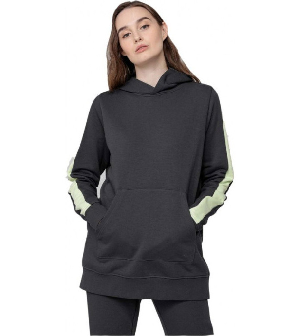 Bluza damska z kapturem, bez zapinania. Przednia kieszeń pomieści najpotrzebniejsze drobiazgi, a luźny krój gwarantuje wygodę podczas codziennych czynności.