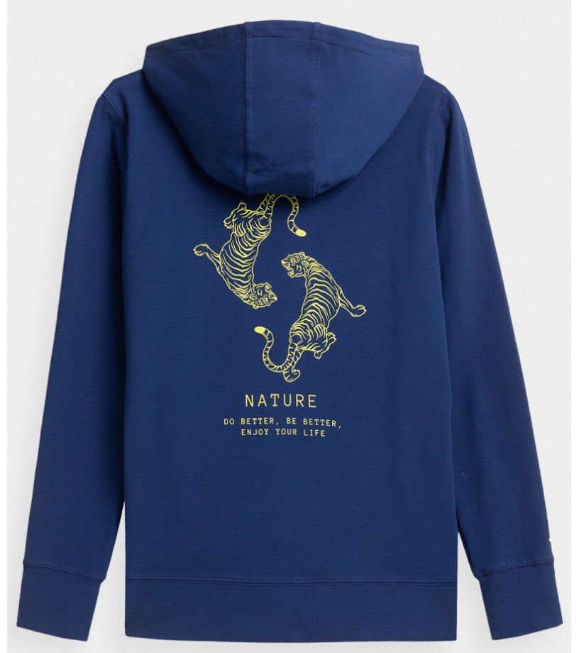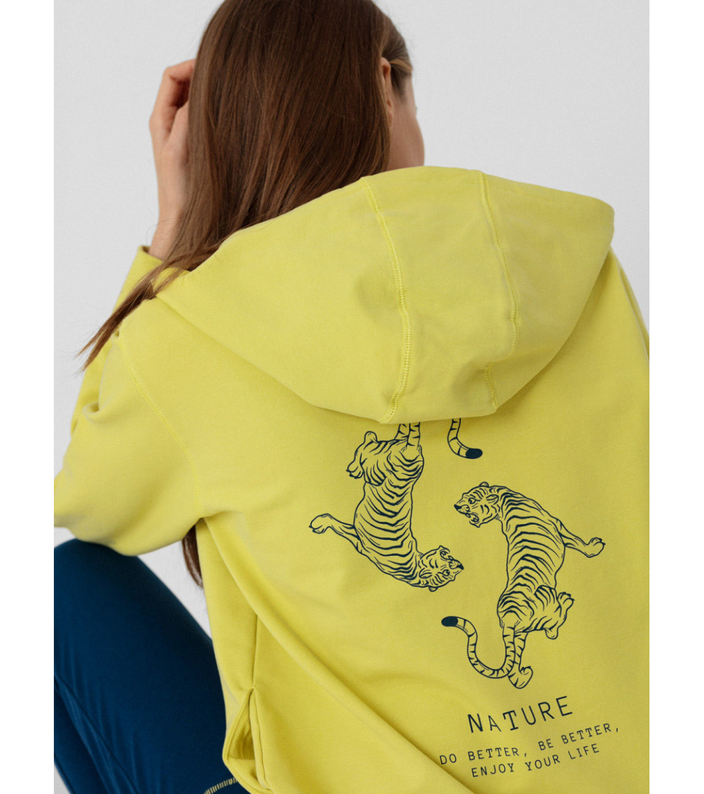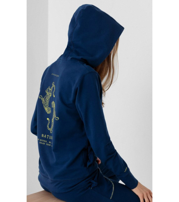 Ta damska bluza jest wykonana z lekkiej bawełny z kieszenią kangurkową i kapturem. Bluza świetnie nadaje się na relaks lub wyjście na kawę. Damska bluza z kapturem ma klasyczne ściągacze na mankietach i u dołu.