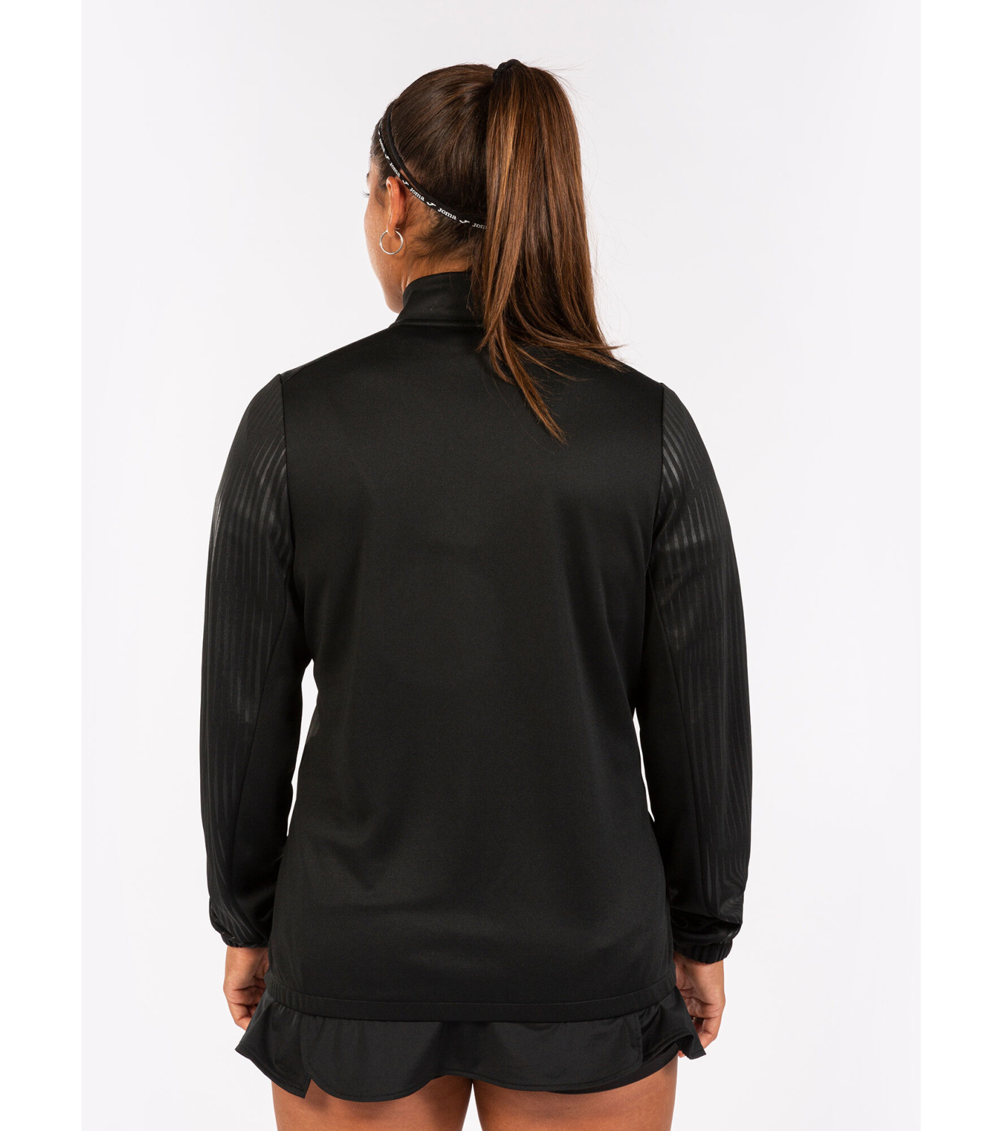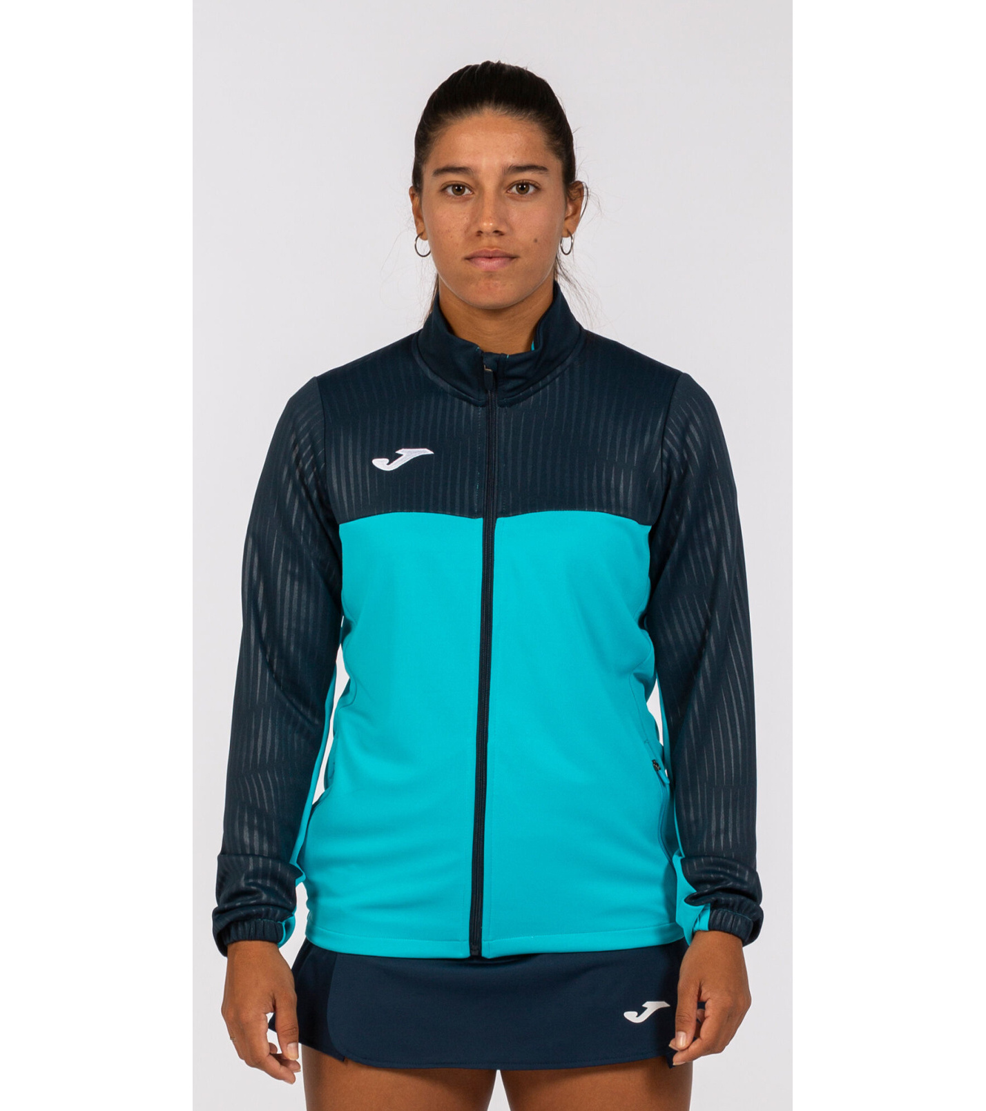 Damska bluza do gry w tenisa i innych sportów. Bardzo wygodna do treningu w zimne dni. Wykonana z wygodnego i wytrzymałego materiału, o dopasowanym kroju, który precyzyjnie dopasowuje się do każdego ruchu. Można ją nosić przed, w trakcie i po uprawianiu sportu. Bluza ma zamek błyskawiczny na całej długości, z osłoną podbródka. Dzięki temu zamek błyskawiczny nie będzie podrażniał skóry podczas zabawy. Kurtka ma również wysoki kołnierz ze ściągaczem od wewnątrz, który zapewnia wygodę i ochronę przed zimnem. W mankietach i na dole dodano gumę, aby zapobiec przedostawaniu się zimnego powietrza i ucieczce ciepła. Ma również dwie przednie kieszenie zapinane na suwak. Sportowcy mogą jej używać do przechowywania i przenoszenia drobnych przedmiotów osobistych, np. telefonu komórkowego lub kluczy, nie martwiąc się o ich zgubienie. Dzięki swoim właściwościom oddychającym pomaga również odprowadzać pot.