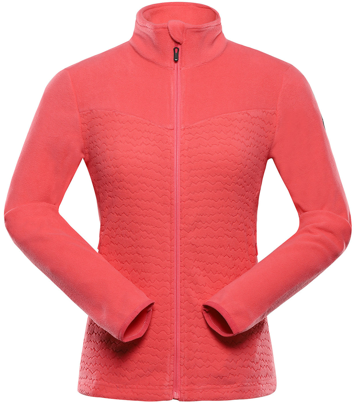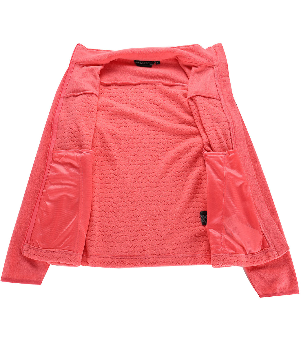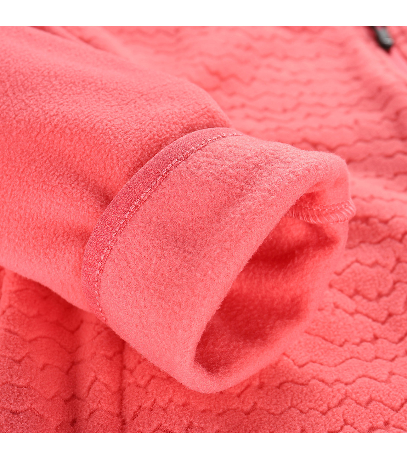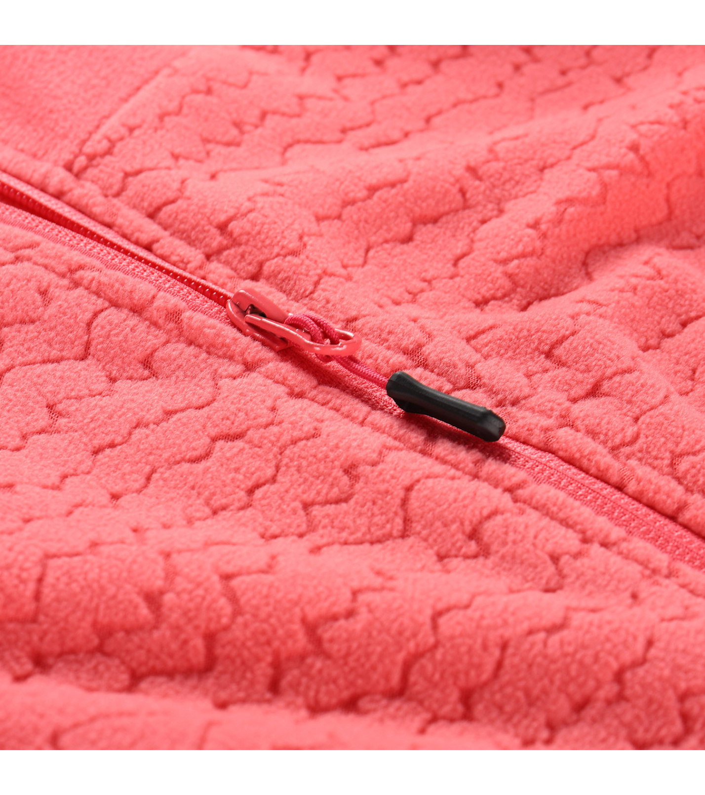 Damska bluza polarowa wykonana jest w 100% z poliestru o strukturze mikropolaru, który jest ciepły, paroprzepuszczalny i elastyczny, dzięki czemu zapewnia wysoki komfort noszenia. Tłoczony materiał nadaje bluzie nowoczesny wygląd i podnosi jej atrakcyjność. Pół-dopasowany krój podkreśla sylwetkę i nie krępuje ruchów. Praktyczny, wysoki kołnierz z osłoną podbródka chroni przed zimnem, a rękawy wykończone gumką dobrze trzymają się kształtu i zapobiegają utracie ciepła.