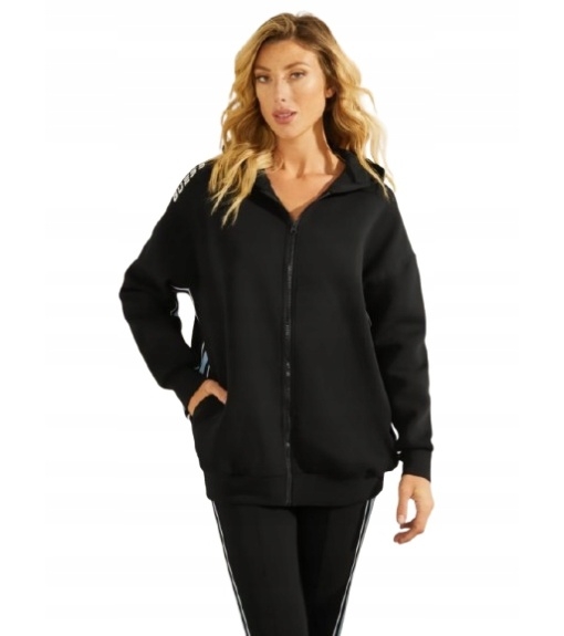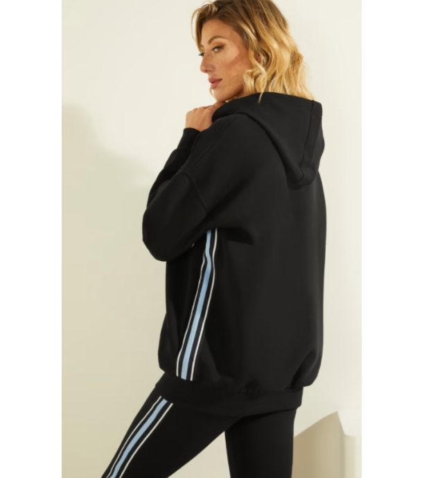 Stylowa, zapinana na zamek bluza z kapturem w kolorze czarnym to idealny wybór na co dzień i do aktywności na świeżym powietrzu. Nowoczesny design uzupełniają kontrastujące niebiesko-białe paski na rękawach, które nadają bluzie sportowy i dynamiczny wygląd. Subtelny napis na ramieniu podkreśla minimalistyczny styl.