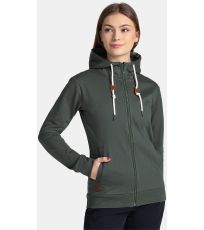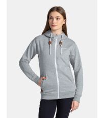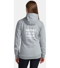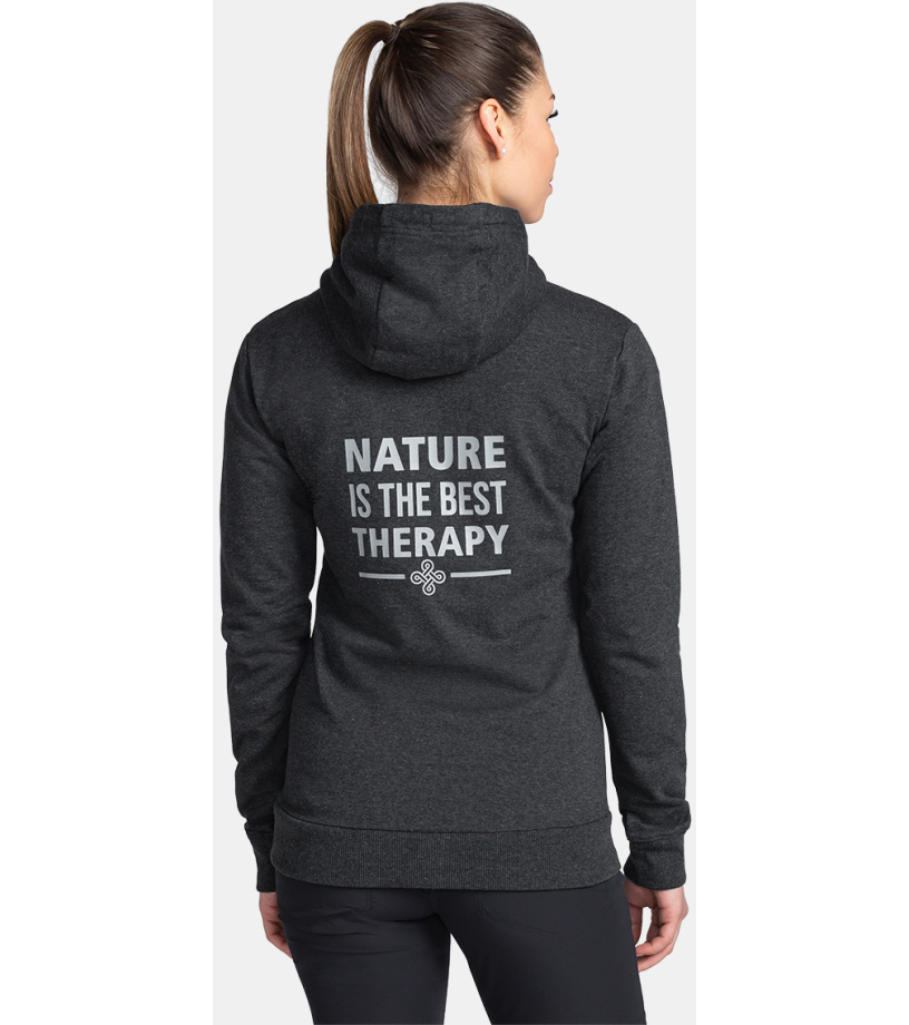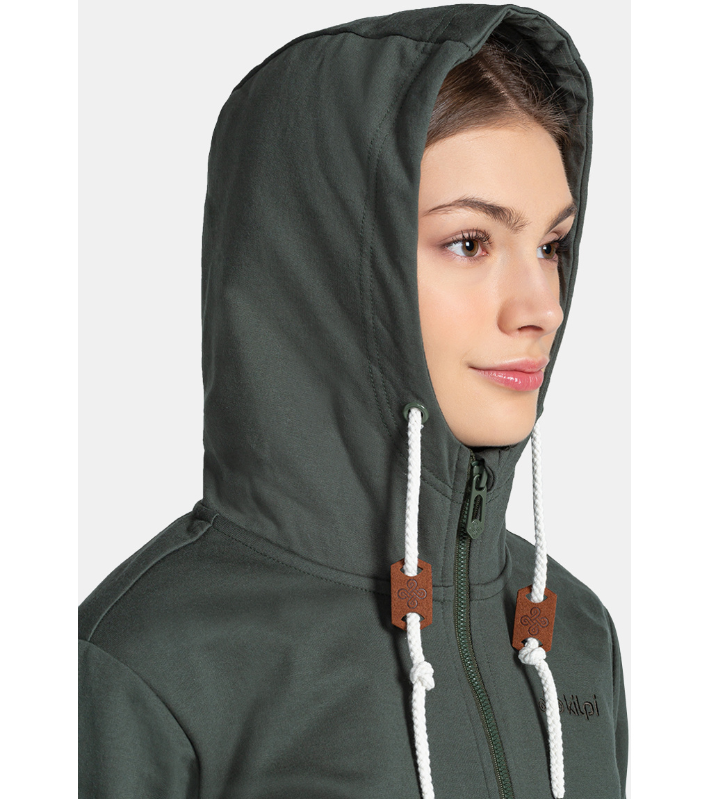 Bawełniana bluza damska Kilpi BERY-W z suwakiem na całej długości, kapturem i dwiema kieszeniami. Subtelny jednokolorowy design jest uzupełniony nadrukowanym sloganem i naszywkami. Dolny brzeg i rękawy wykończone są elastycznym ściągaczem.
