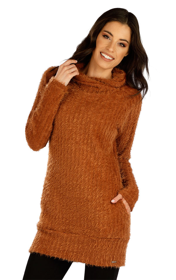Damska sukienka z dzianiny. Przekrzyżowana stójka. Praktyczne kieszenie boczne. Szeroki mankiet na całym obwodzie sukienki. Oryginalny wygląd dzianiny o plastycznym wzorze i miękkiej, przyjemnej fakturze. Długość sukienki ok. 80 cm.