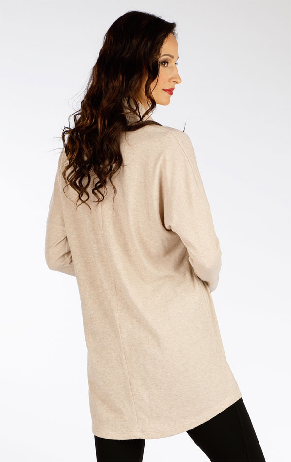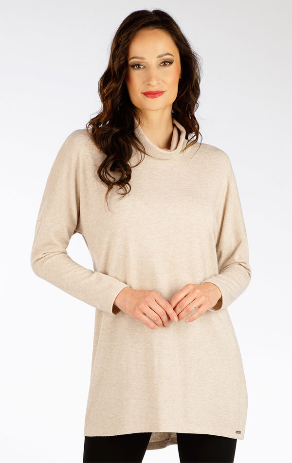 Luźny krój z obniżonym golfem, bez kieszeni i dłuższym tyłem. Elastyczna i miękka dzianina w beżowym melanżu z efektowną, błyszczącą nitką. Materiał z domieszką wiskozy i elastanu jest bardzo przyjemny dla ciała, lejący i nie gniecie się. Długość tuniki ok. 85 cm.
