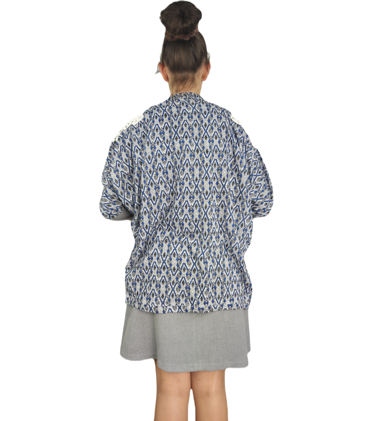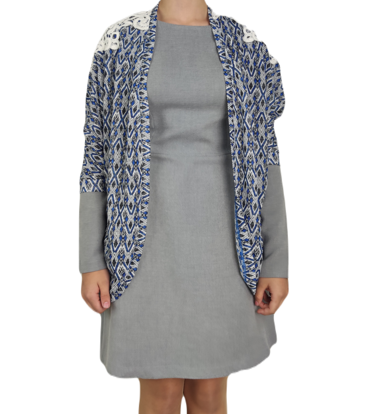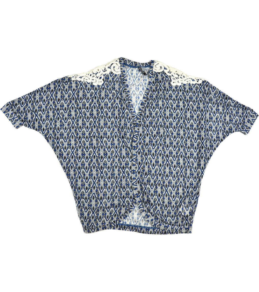 Damska narzutka z krótkim rękawem. Sweter ozdobiony jest na ramionach subtelną koronką. Rękawy mają zwężane mankiety.