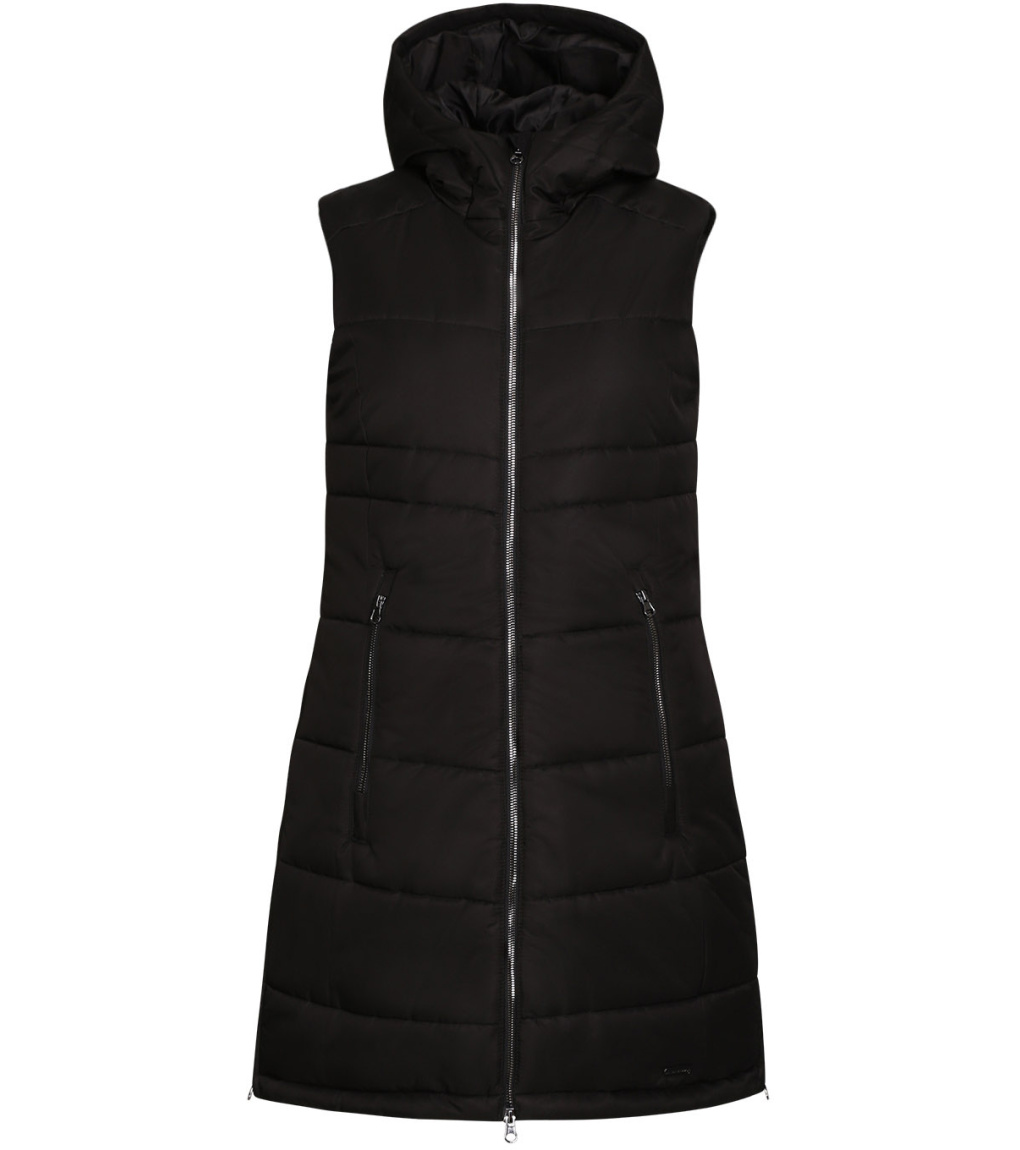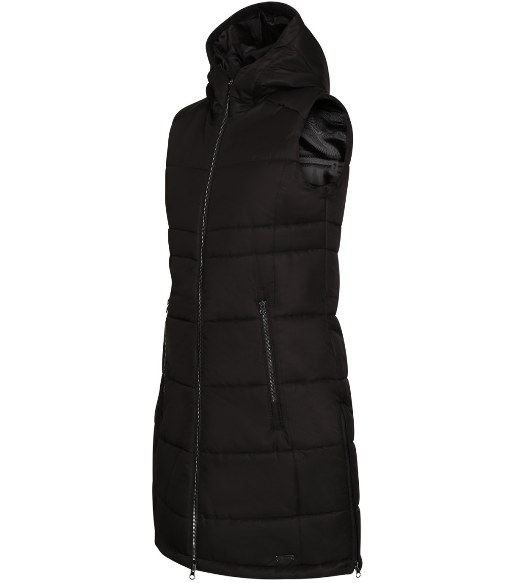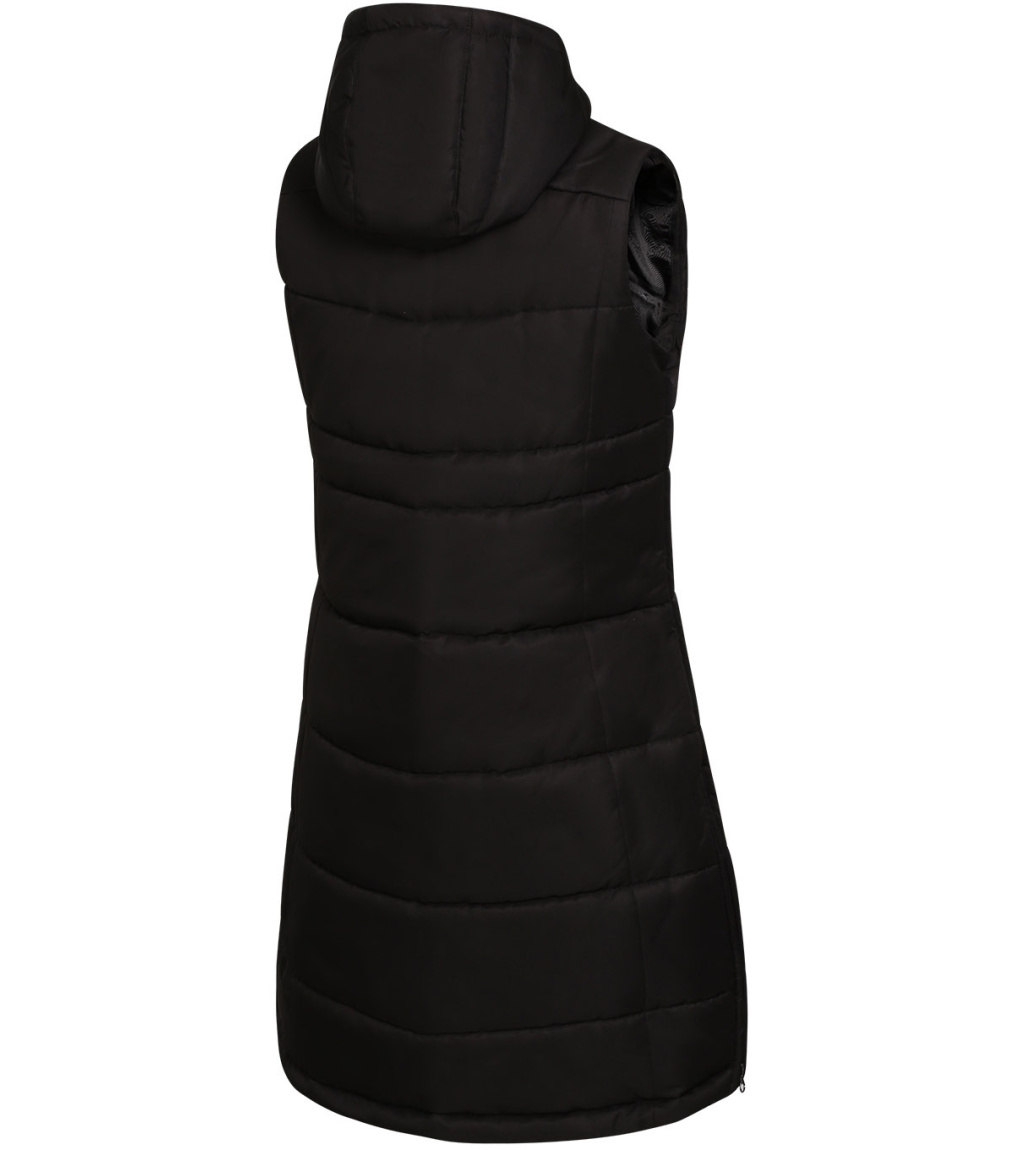 Kamizelka ma grube wypełnienie i kontrastową podszewkę, która zapewnia ciepło i styl. Półdopasowany krój z ozdobnymi przeszyciami nadaje kamizelce elegancki wygląd, a nieodpinany kaptur i osłona podbródka zapewniają ochronę przed złą pogodą. W środku znajdują się dwie kieszenie, w tym jedna zapinana na zamek, umożliwiające bezpieczne przechowywanie drobnych przedmiotów. Kamizelka ozdobiona jest również naszywką z przodu, która nadaje jej wyrazisty styl.