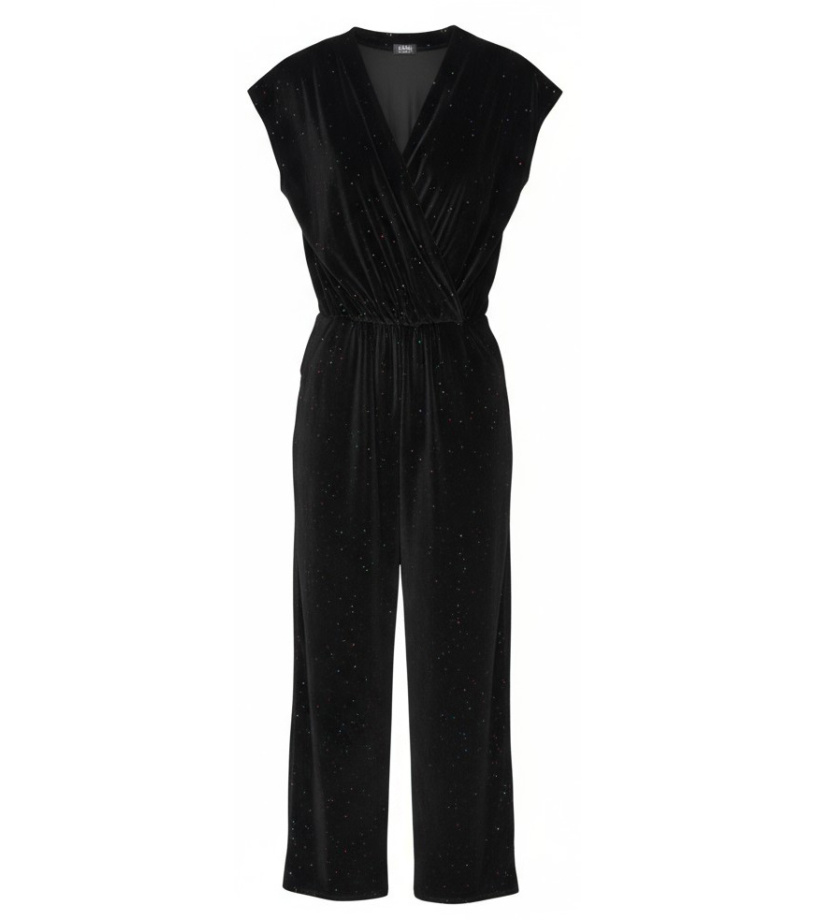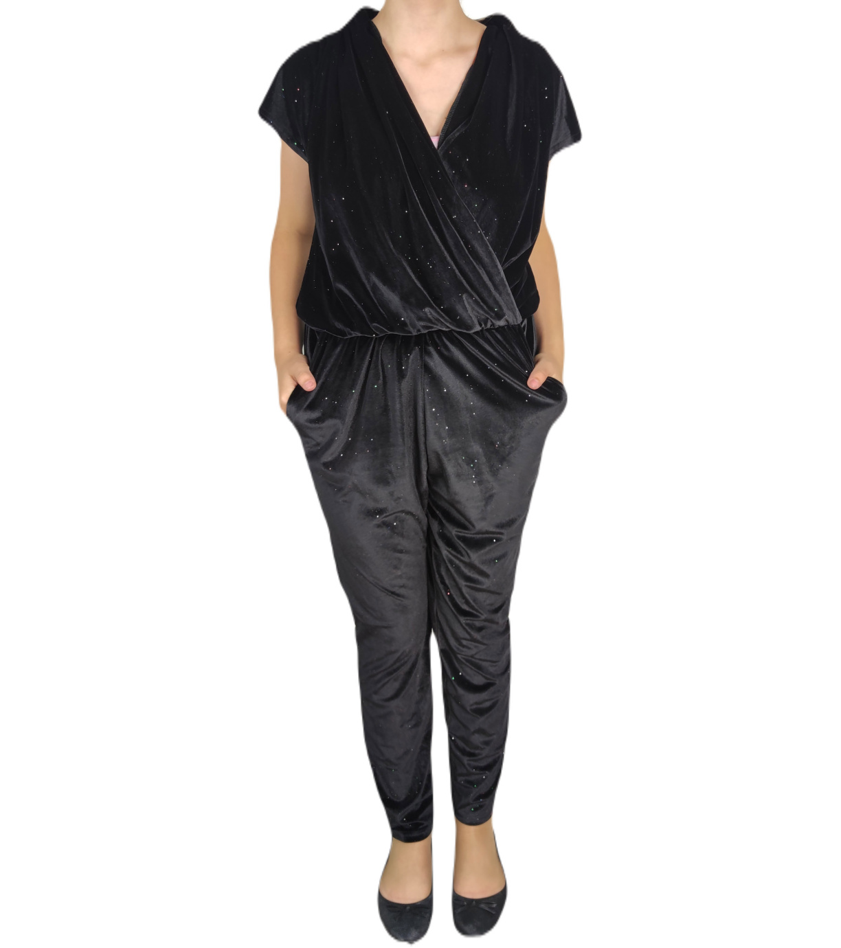 Kombinezon damski z obniżonymi rękawami. Kombinezon ściągany w pasie gumką. Dekolt w literę V. Kombinezon ozdobiony kolorowymi cekinami. Zamszowy materiał jest bardzo przyjemny.