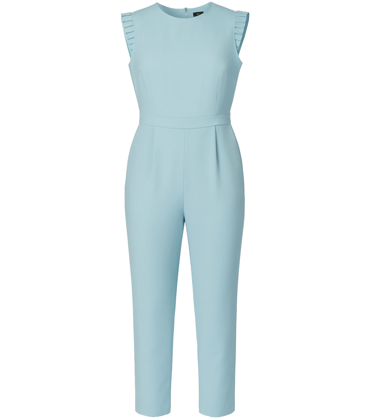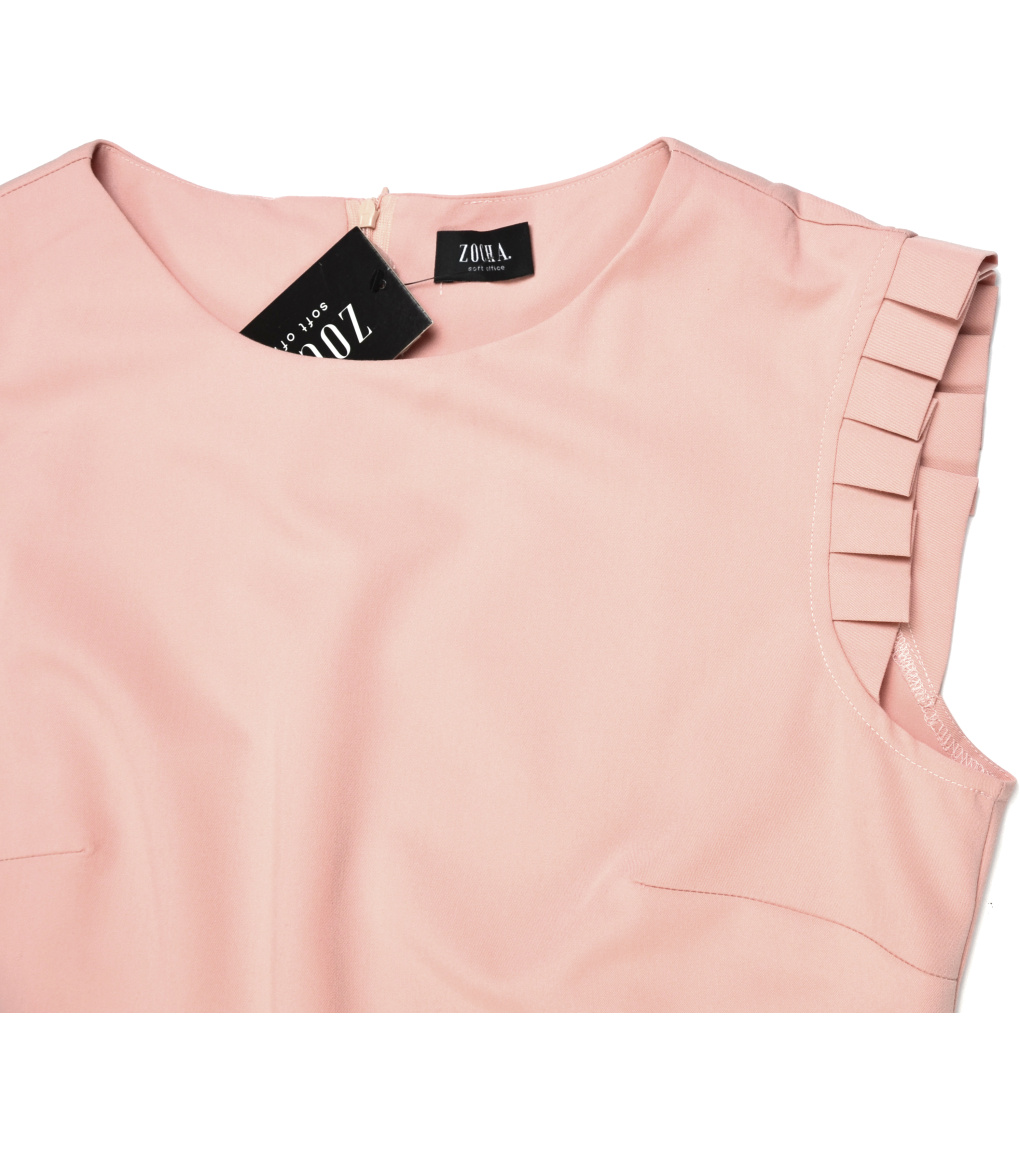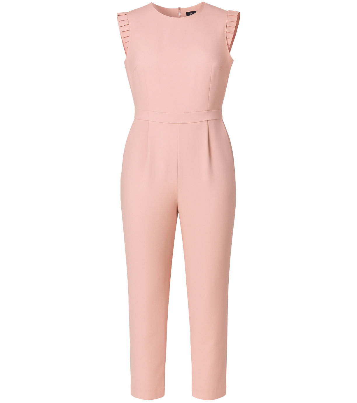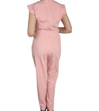 Kombinezon damski bez rękawów. Wstawki z przodu i z tyłu. W talii elegancka listwa rozdzielająca górę i dół. Kombinezon ma dwie kieszenie oraz zapięcie na zamek z tyłu. Rękawy ozdobione są falbankami.