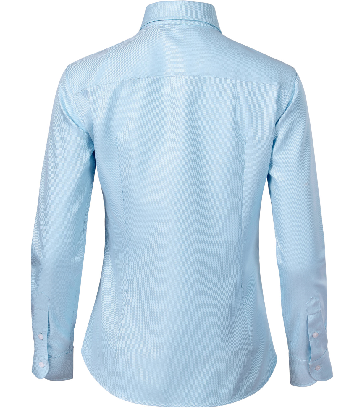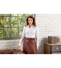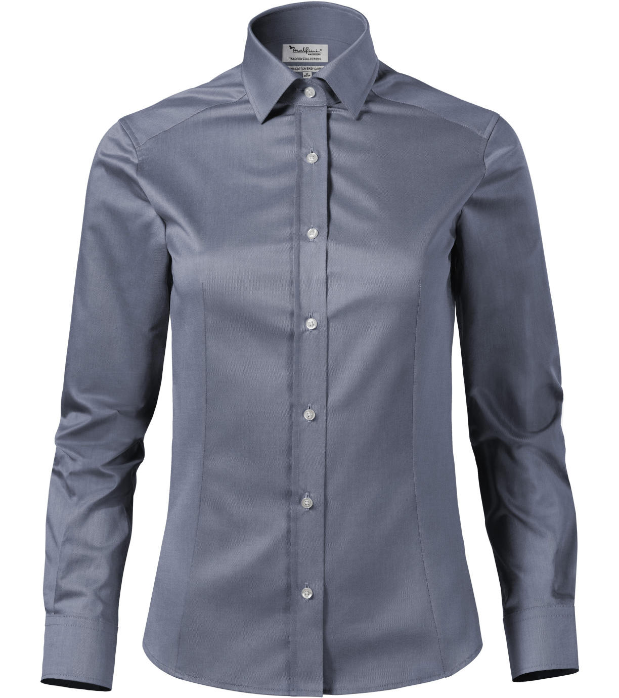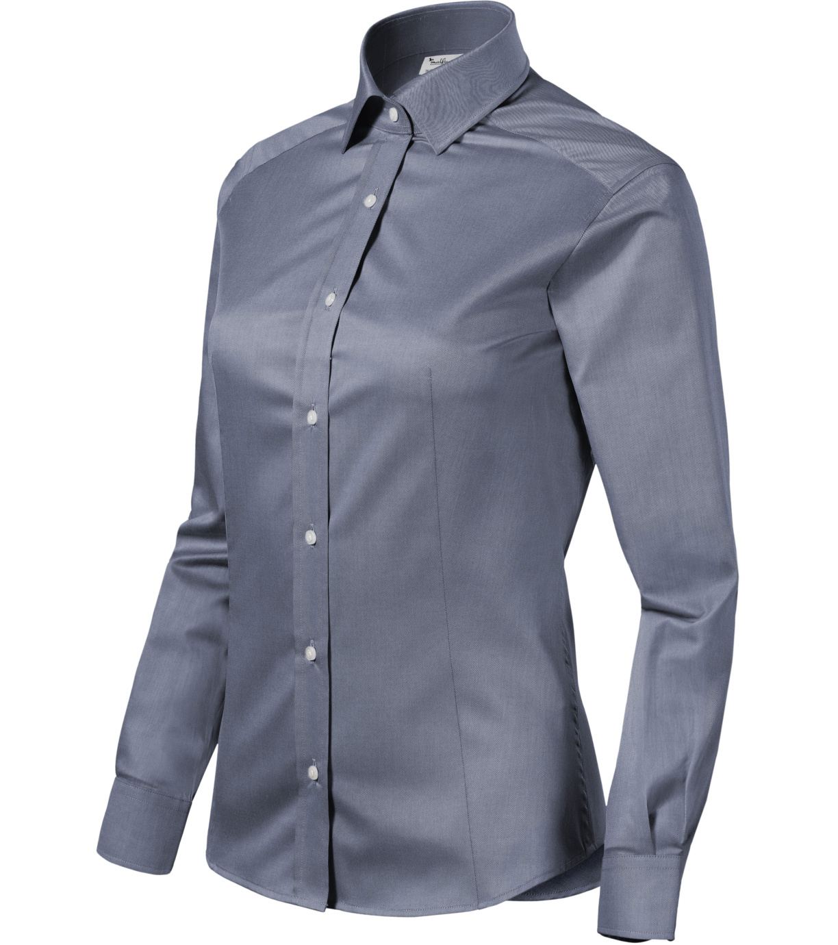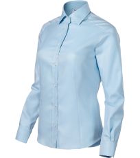 Koszula damska zaprojektowana przez czołowego czeskiego krawca Romana Humlíčka, wykonana z wyjątkowo długowłóknistej przędzy, dopasowany krój ze szwami bocznymi, podwójne zaszewki i zaszewki z tyłu, zaszewki w talii z przodu, dwuczęściowy kołnierzyk koszuli, przednie krawędzie wykończone lamówką, długie rękawy z okrągłym mankietem z 2 guzikami, guziki z masy perłowej w kolorze 00 (2 zapasowe), profilowany dolny brzeg.