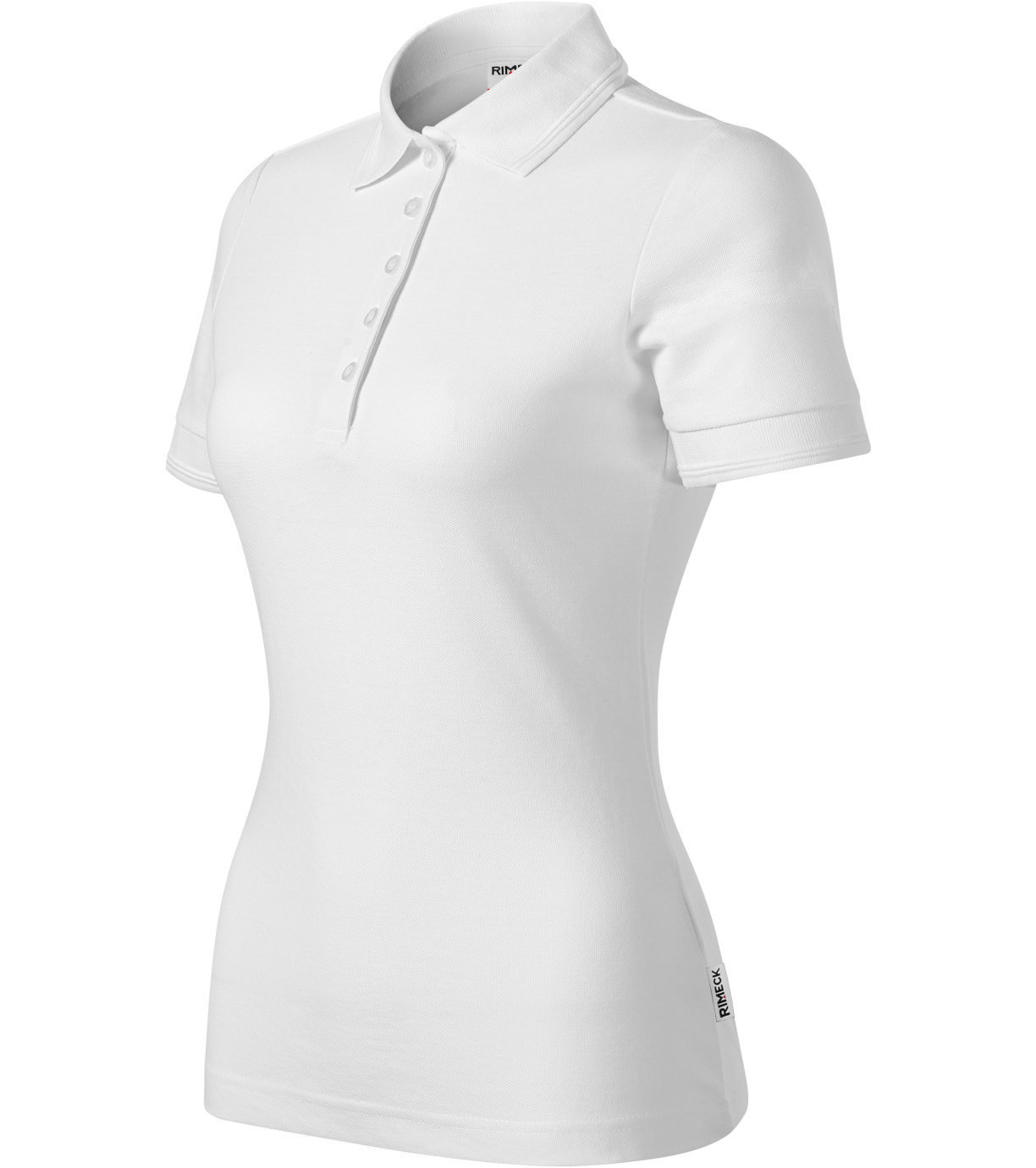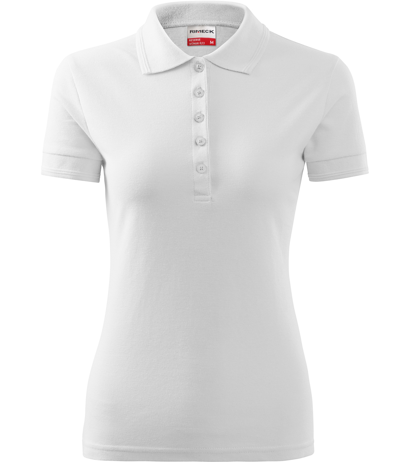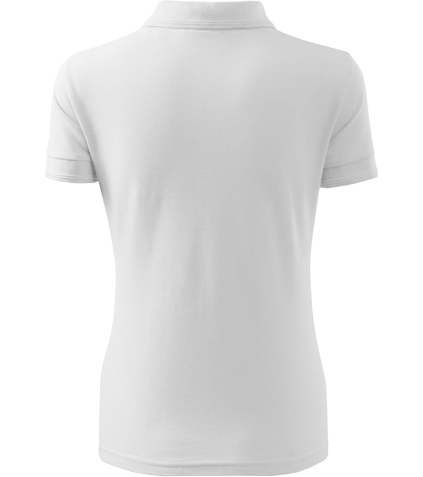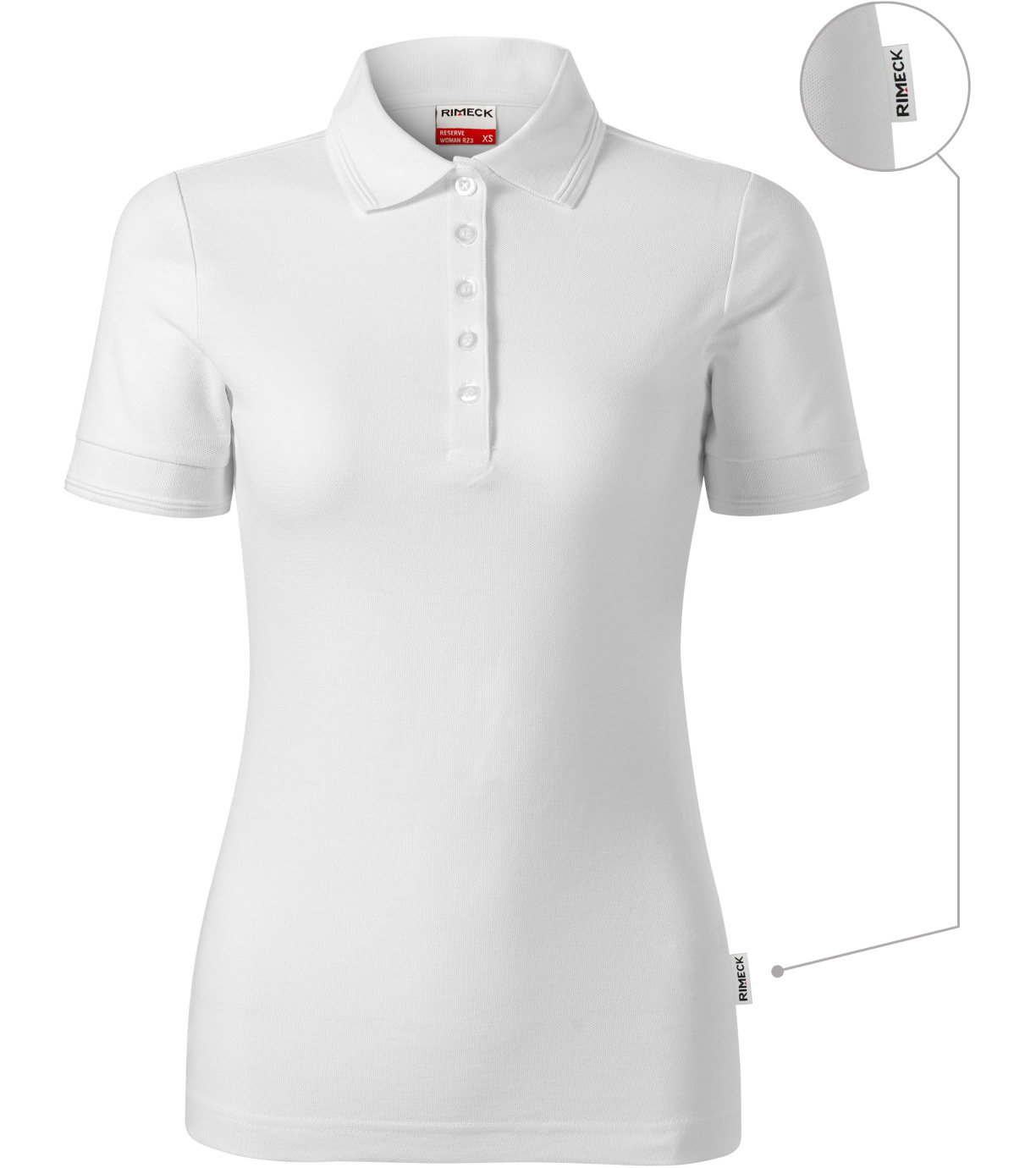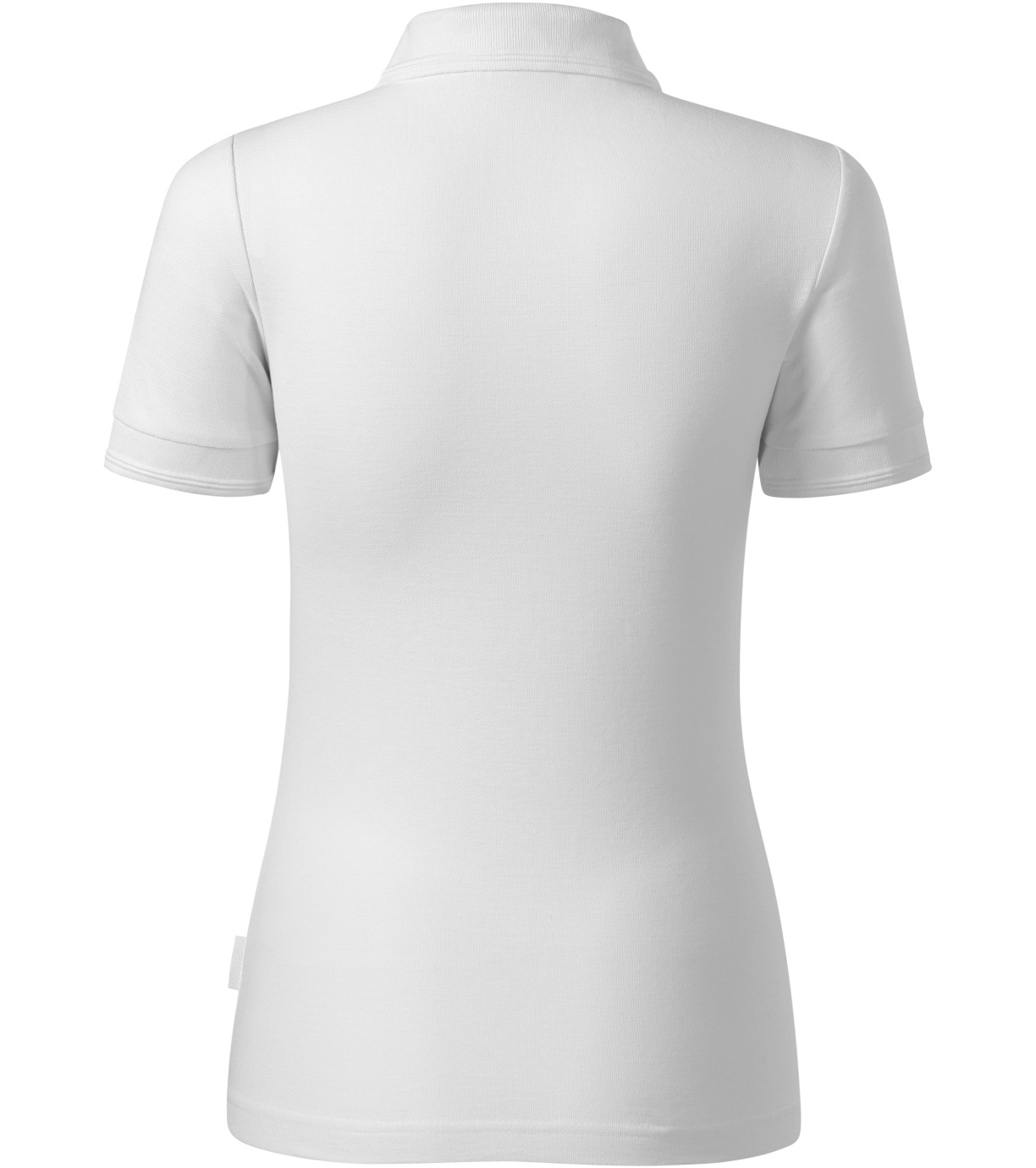 Damska koszulka polo z krótkim rękawem, wykonana jest z wytrzymałego materiału, idealnego do pracy. Posiada lekko dopasowany krój ze szwami bocznymi, kołnierzyk i lamówki rękawów z podwójnie tłoczonym paskiem dzianiny ściągaczowej 1:1 oraz wąską zakładkę zapinaną na 5 guzików w kolorze materiału. Wewnętrzny pasek na karku wykończony taśmą z materiału wierzchniego, a szwy na ramionach wzmocnione taśmą.