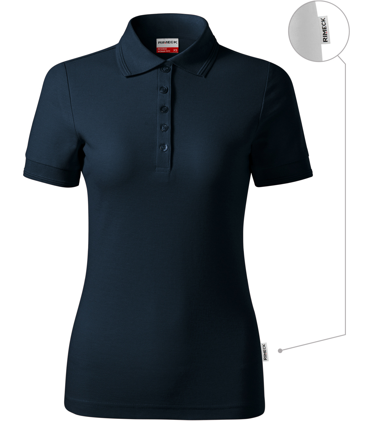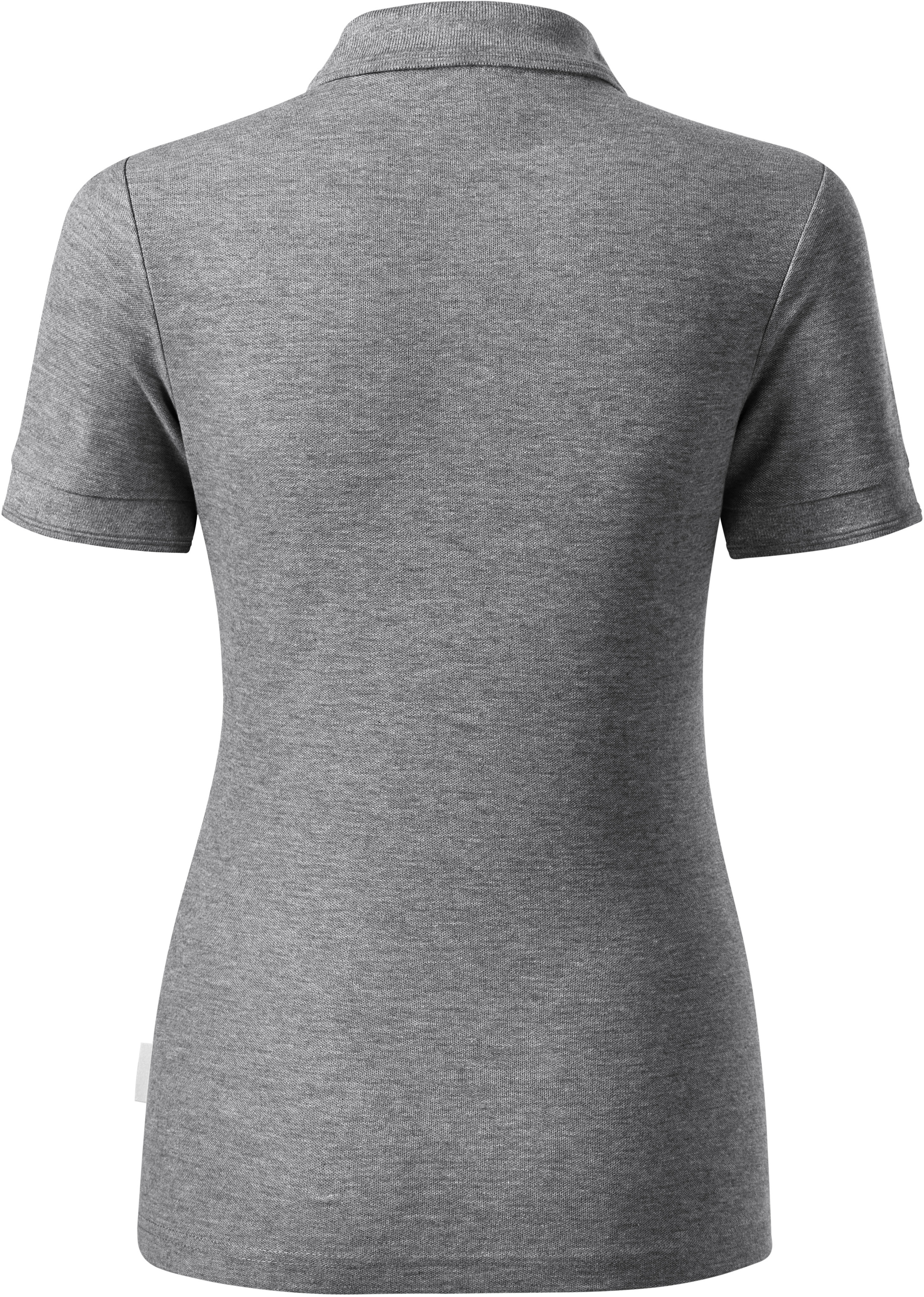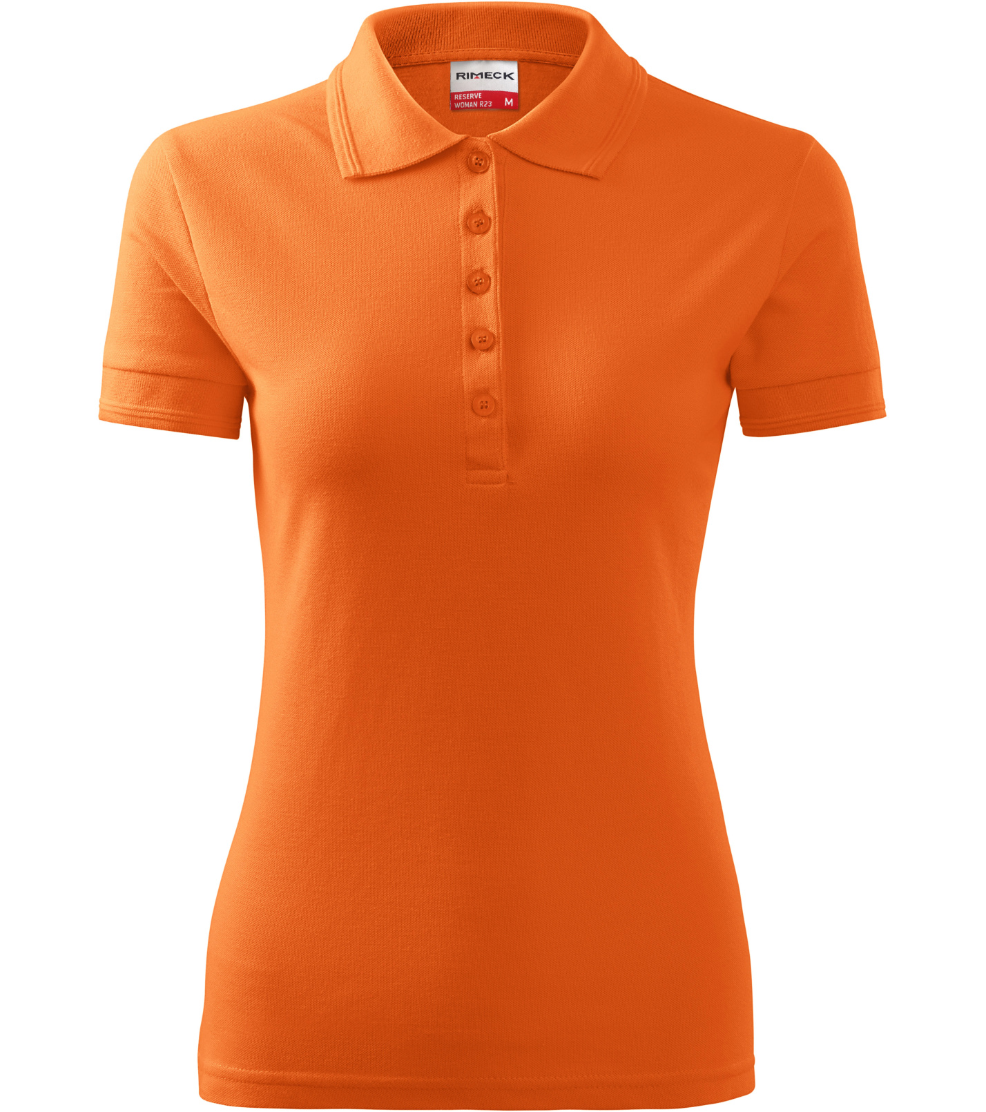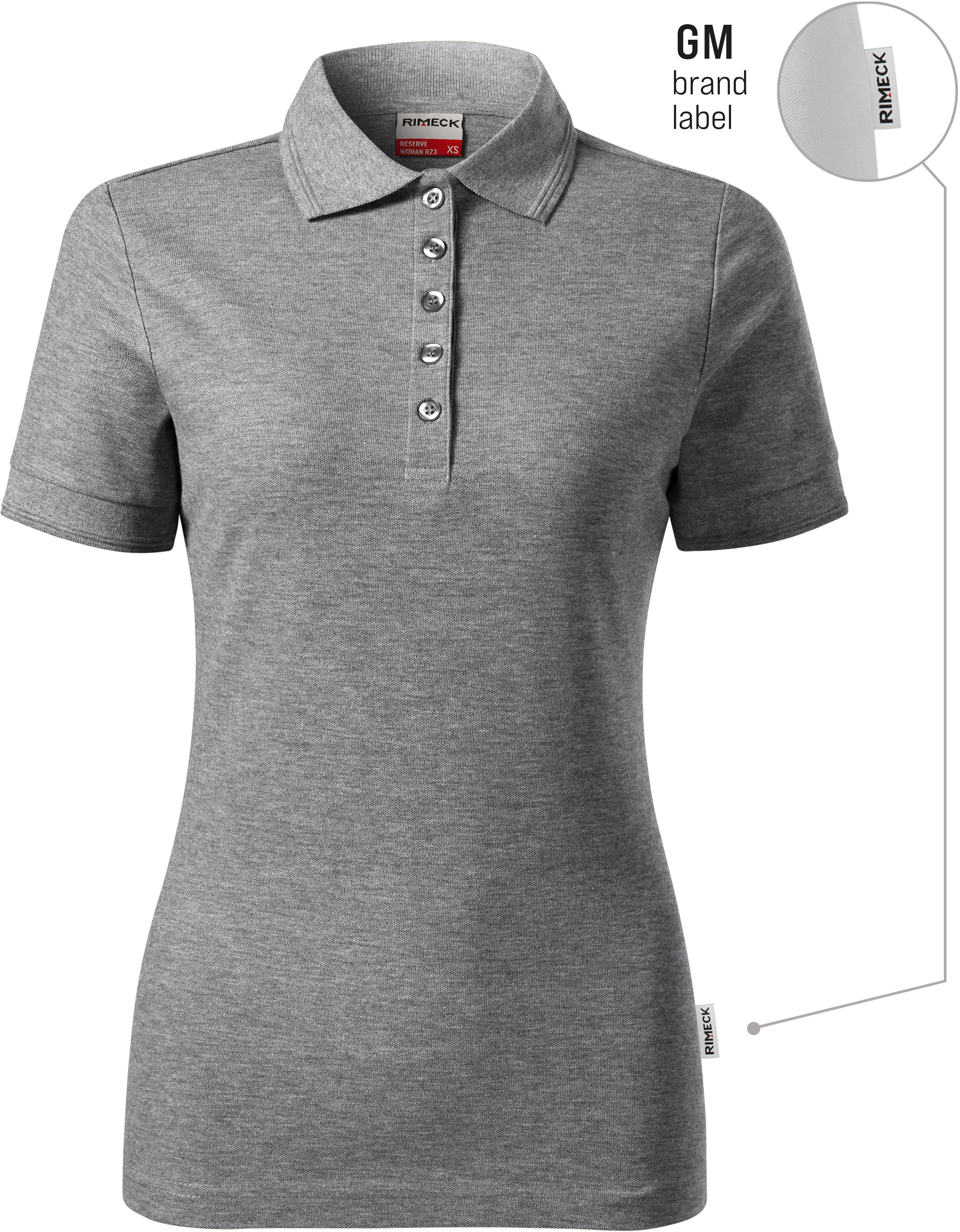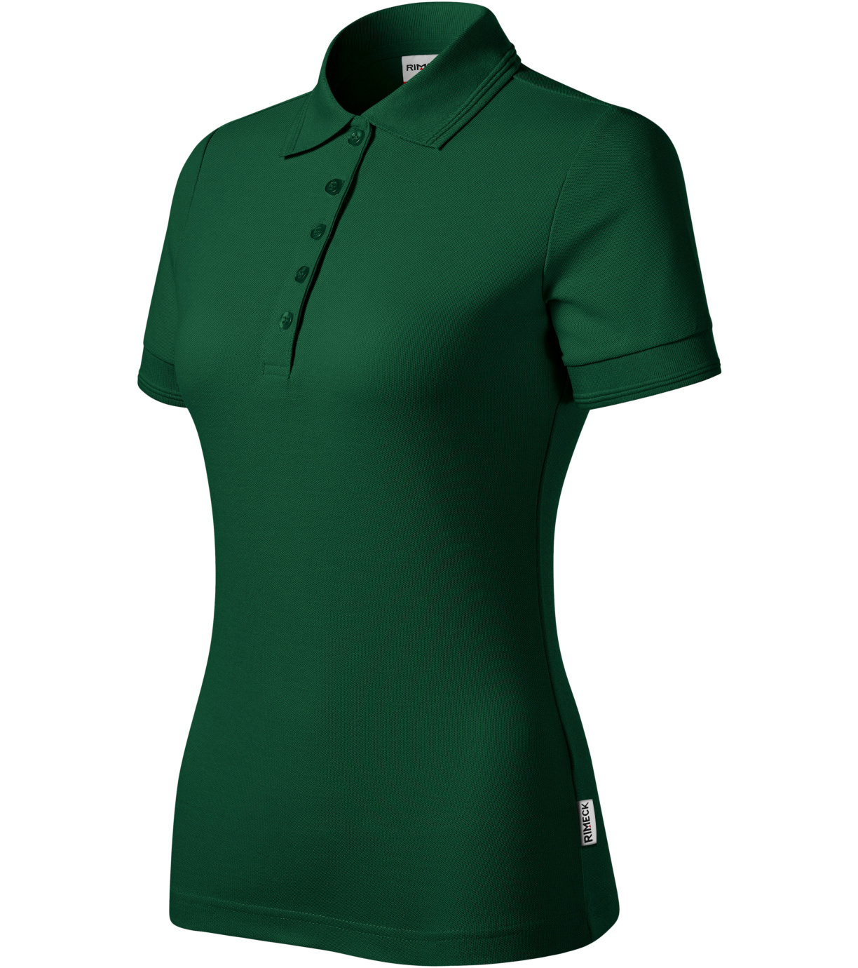 Damska koszulka polo z krótkim rękawem, wykonana jest z wytrzymałego materiału, idealnego do pracy. Posiada lekko dopasowany krój ze szwami bocznymi, kołnierzyk i lamówki rękawów z podwójnie tłoczonym paskiem dzianiny ściągaczowej 1:1 oraz wąską zakładkę zapinaną na 5 guzików w kolorze materiału. Wewnętrzny pasek na karku wykończony taśmą z materiału wierzchniego, a szwy na ramionach wzmocnione taśmą.