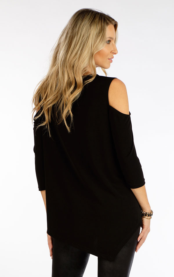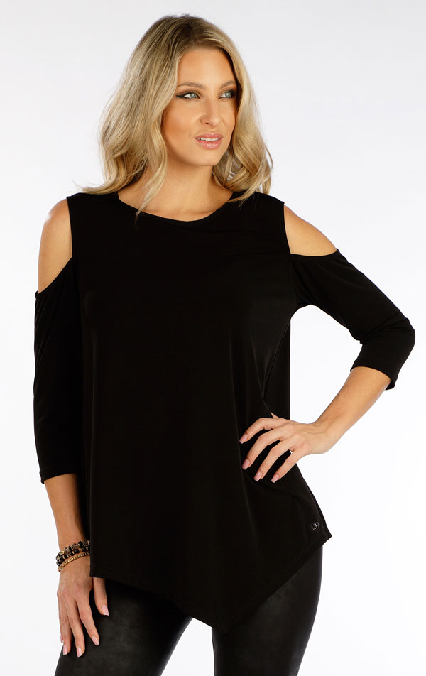Damski t-shirt z rękawem 3/4. Luźna koszulka z efektownym rozcięciem na ramionach. Okrągły dekolt i asymetryczna długość koszulki. Bardzo przyjemny w dotyku i elastyczny materiał, który się nie gniecie, zapewni Ci maksymalny komfort noszenia.