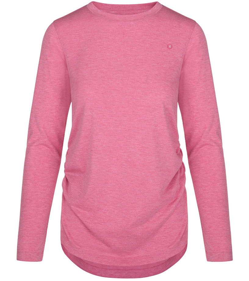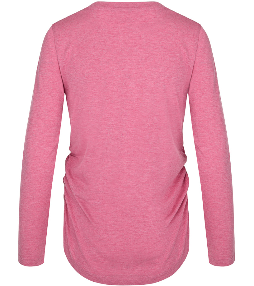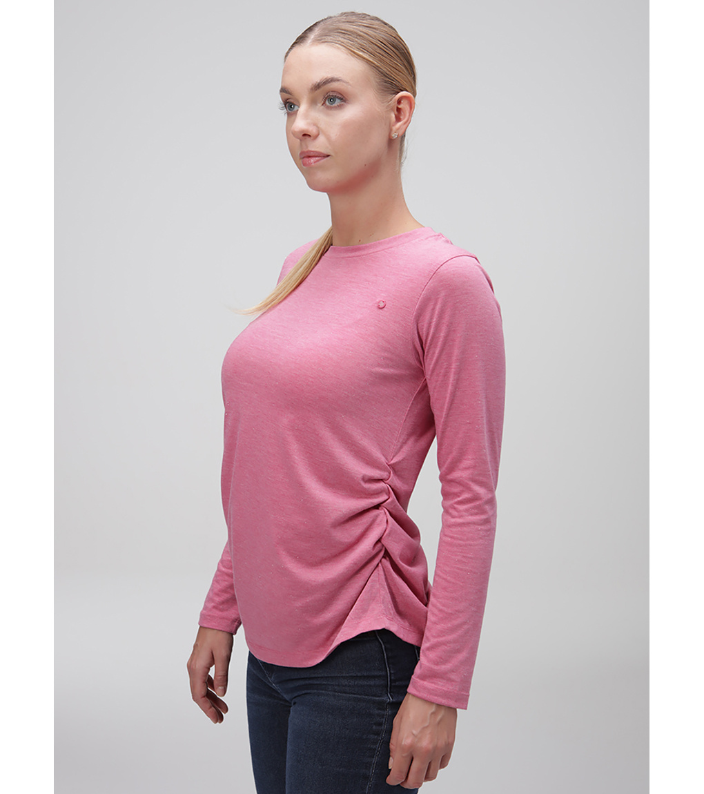 Loap BAXANA to jeden z damskich T-shirtów z długim rękawem, który bez obaw możesz nosić zarówno w czasie wolnym, jak i na wyjście na miasto czy do pracy. Dzięki połączeniu poliestru i wiskozy koszulka wyróżnia się lekkością, właściwościami szybkoschnącymi i mniej się gniecie. Materiał jest również przyjemnie elastyczny. Koszulka w klasycznym kroju jest lekko marszczona w talii, a dolna krawędź nie ma ściągacza. Całość ładnie podkreśla sylwetkę.