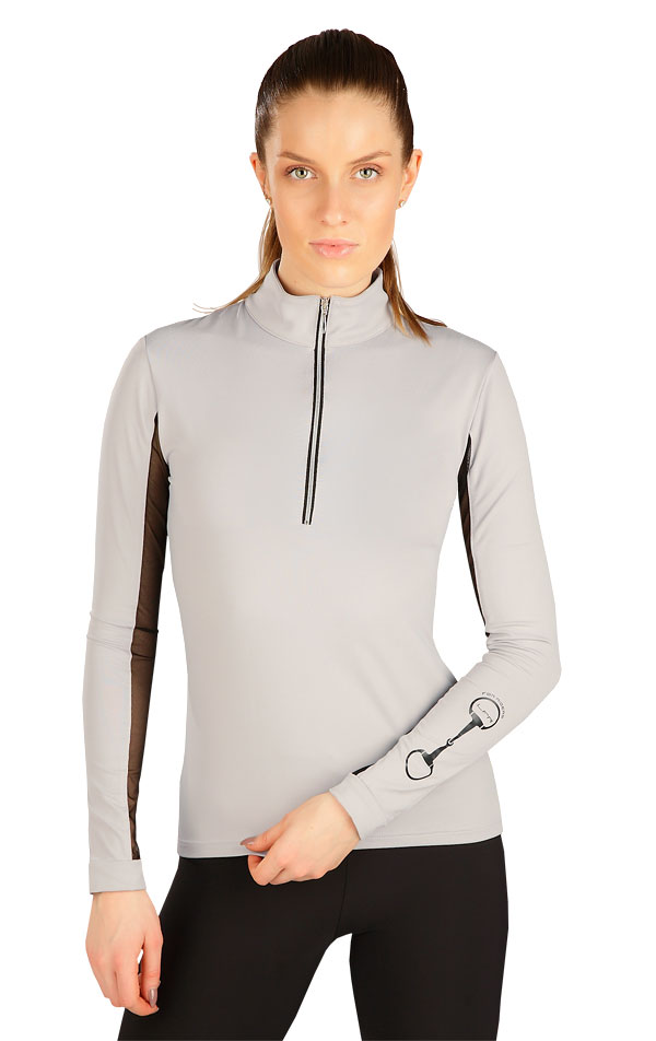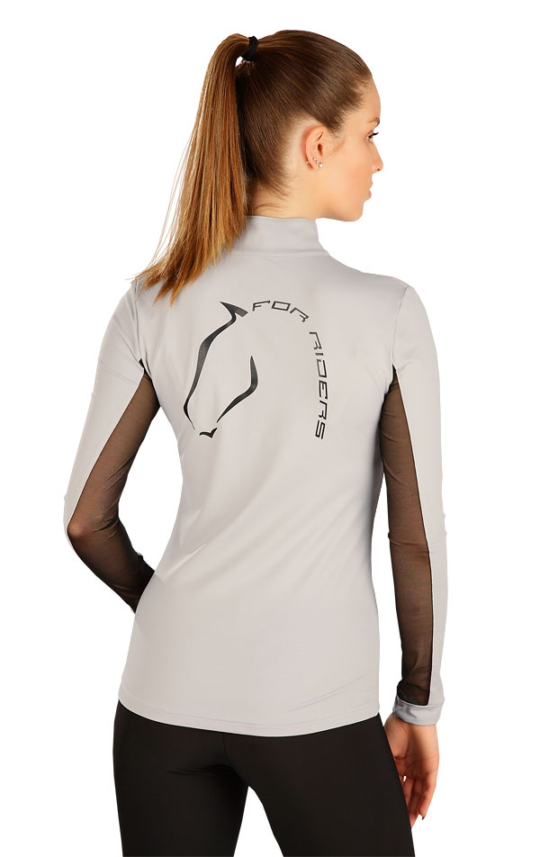 Koszulka damska z długim rękawem. Rękaw połączony z siateczką. Srebrny zamek. Dłuższy tył. Nadruk. Szary + czarny.