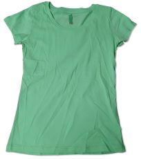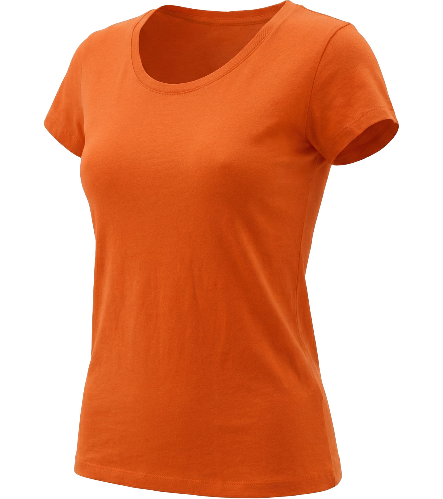 Damski T-shirt o dopasowanym kroju z głębokim, okrągłym dekoltem. Dekolt wykończony jest elastycznym ściągaczem (1,2 cm) z domieszką spandexu, który zapewnia lepsze dopasowanie. Koszulka ma krótkie, dopasowane rękawy, boczne szwy dla większego komfortu oraz podwójne szwy na ramionach. Wewnętrzna część kołnierza i ramiączka wykonane są z bawełny dla większego komfortu.
