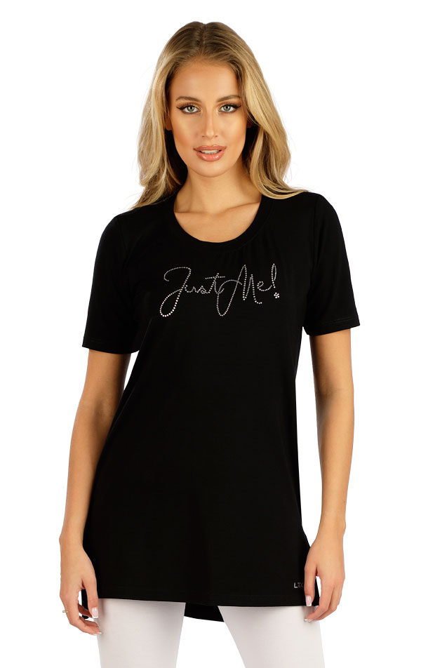 Tunika damska z krótkim rękawem. Okrągły dekolt i aplikacje ze srebrnych kryształków z przodu. Dłuższy tył i rozcięcia po bokach. Materiał wiskozowy jest przyjemnie miękki, elastyczny i bardzo wygodny w noszeniu. Bardzo łatwy do łączenia element garderoby, szczególnie z naszymi legginsami. Długość tuniki ok. 80 cm.