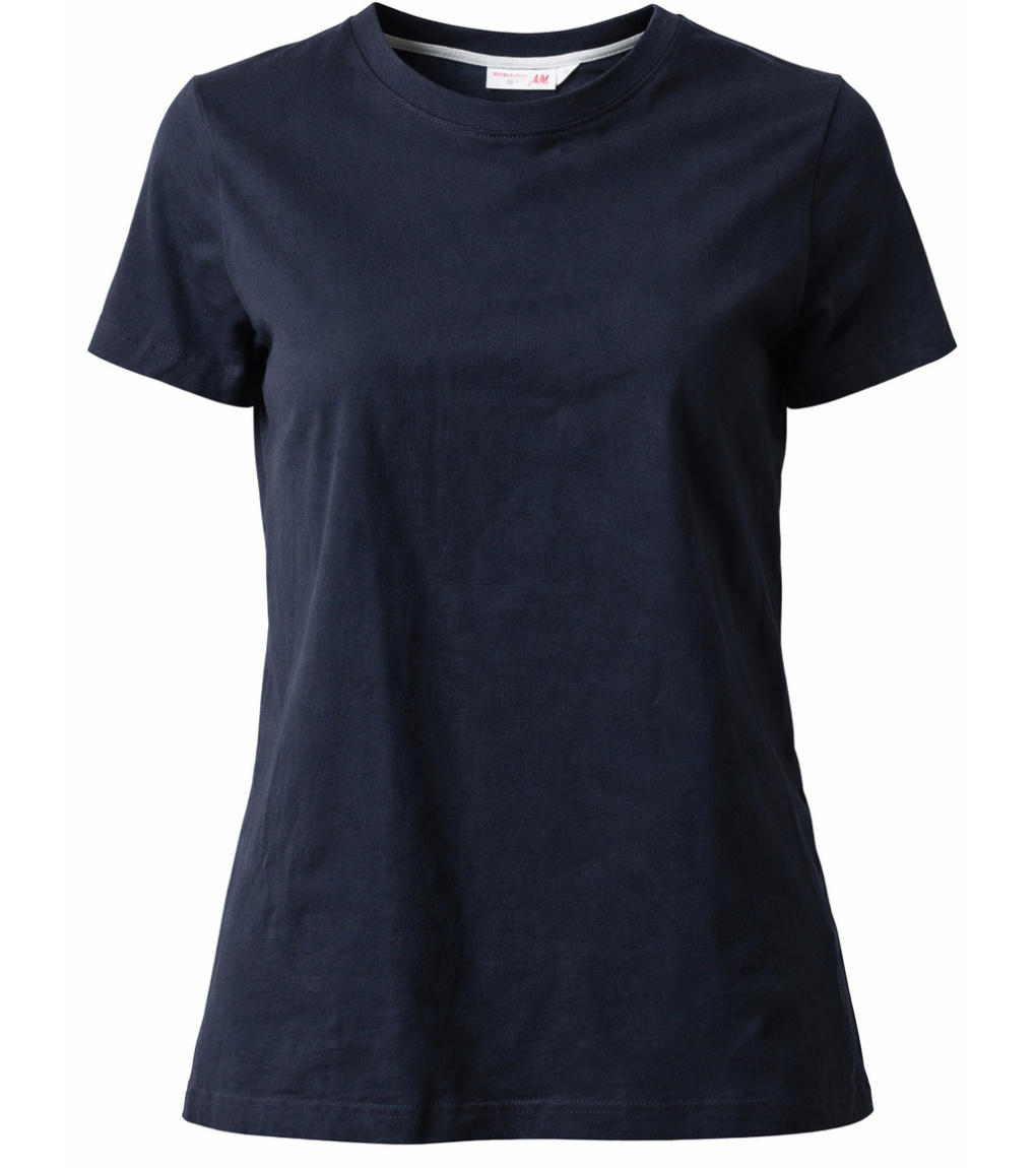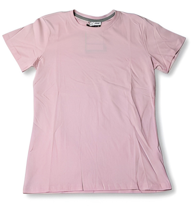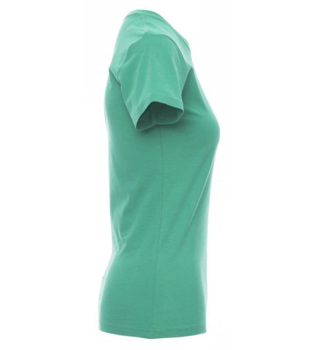 Damska koszulka z krótkim rękawem i okrągłym dekoltem, ściągacz elastyczny o szerokości 1,5 cm z domieszką spandexu przy szyi, przeszycia z przodu, kontrastowa taśma wzmacniająca od ramienia do ramienia widoczna na kołnierzyku, elastyczne szwy, szwy boczne.