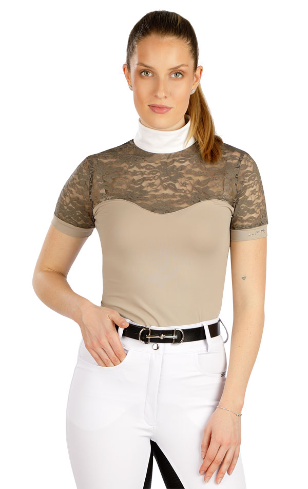 Damska koszulka wyścigowa o dopasowanym kroju. Stójka zapinana z tyłu. Gładki materiał jest bardzo miękki, lekki, oddychający i bardzo wygodny w noszeniu. Całość uzupełnia elegancka koronka z przodu i z tyłu oraz na rękawach.