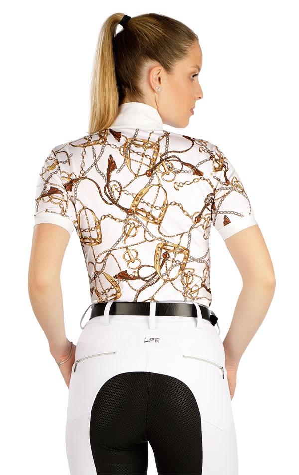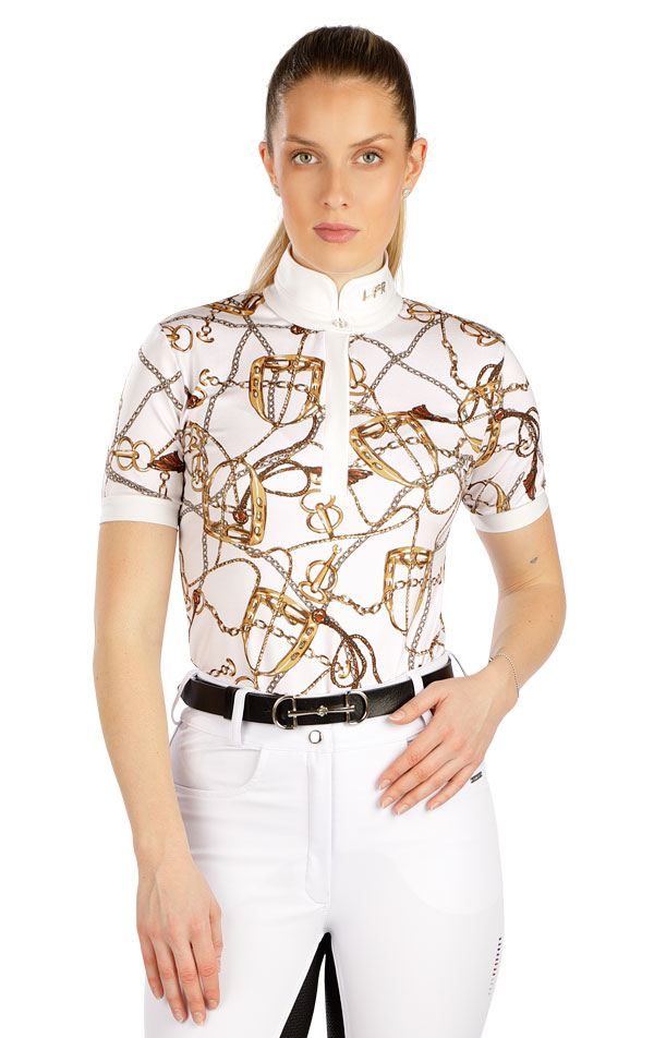 Damska koszulka wyścigowa o dopasowanym kroju. Stójka ozdobiona jest guzikiem „Crystals from Swarovski”. Zakładka zapinana na ukryte guziki. Wysokiej jakości materiał funkcjonalny gwarantuje wysoki komfort podczas całodziennego noszenia. Materiał jest bardzo lekki, oddychający, elastyczny i szybkoschnący. Stylowy nadruk nadaje tej koszulce oryginalności.