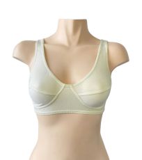 Biustonosz z szerszymi ramiączkami, zakładany przez głowę, szyta damska bielizna sportowa. W dolną krawędź wszyta jest wąska gumka. W pachach i dekoldzie wszyta jest wąska gumka. Biustonosz jest jednokolorowy.