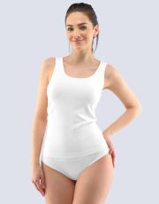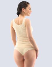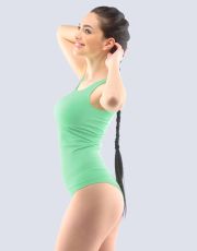 Podkoszulek z szerszymi ramiączkami, bezszwowa bielizna damska. Dolna krawędź jest wykończona bezszwowo. W pachach i dekoldzie wszyta jest wąska gumka. Ramiączka lekko zwężają się z przodu, tworząc ładnie wymodelowany dekolt. Koszulka bez rękawów jest jednokolorowa. Nie ma logo. Podkoszulek ma przedłużoną długość.