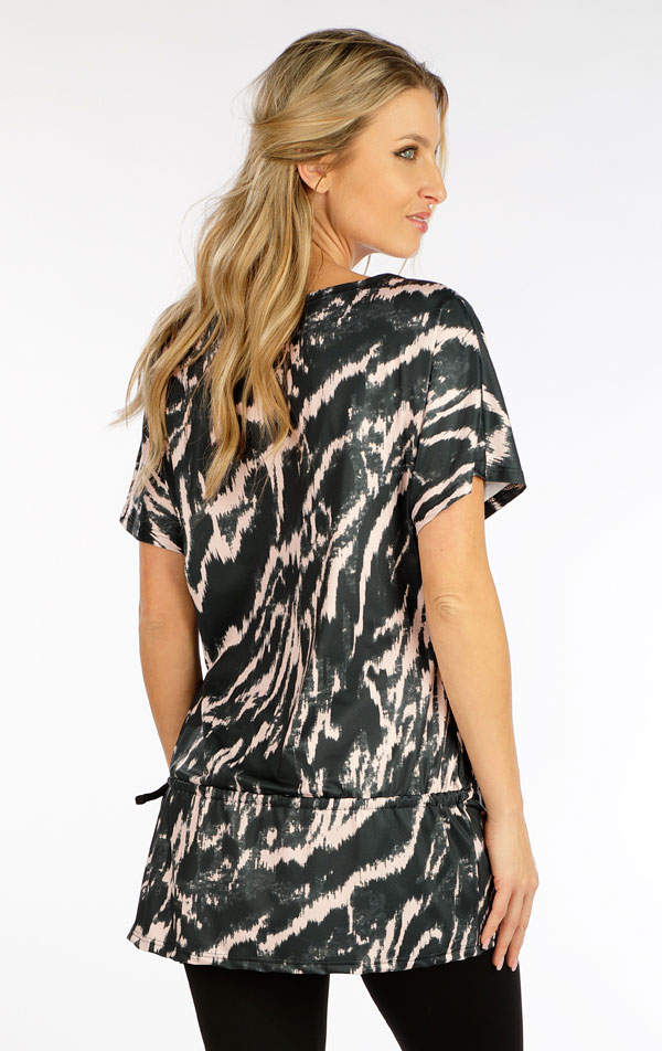 Tunika damska z krótkimi rękawami. Pomysłowy krój ze ściągaczem w biodrach. Można ją łączyć z naszymi ulubionymi legginsami. Materiał gwarantuje doskonały przepływ, elastyczność i maksymalny komfort noszenia. Z pewnością docenisz odporność na zagniecenia i łatwość konserwacji.