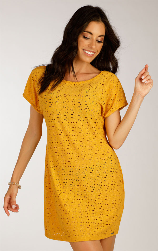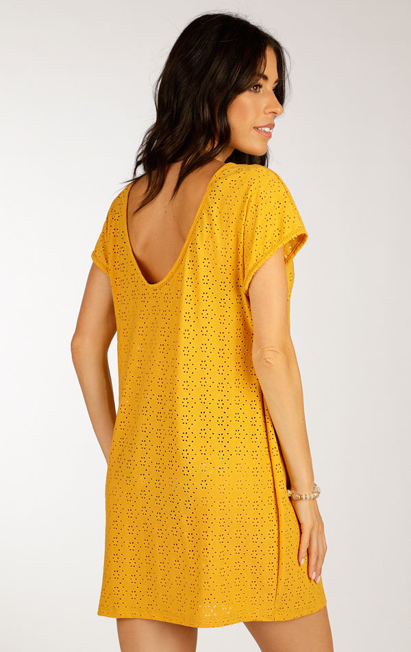 Damska tunika plażowa z krótkimi rękawami. Prosty krój z głębokim wycięciem w serek z tyłu. Imponujący perforowany wzór dodaje tunice niepowtarzalnego stylu i uroku. Materiał, z którego jest wykonana, gwarantuje doskonałą oddychalność, maksymalny komfort noszenia i łatwą konserwację. Długość tuniki ok. 85 cm.