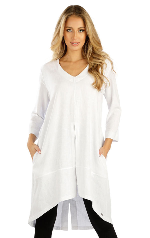 Luźna tunika z dekoltem w serek. Tunika o dopasowanym kroju z rozcięciem z przodu i z tyłu. Praktyczne kieszenie boczne. Skład materiału gwarantuje doskonałą oddychalność, miękkość i przyjemne uczucie podczas noszenia. Bardzo praktyczny i wygodny element garderoby o nowoczesnym kroju, który idealnie uzupełni Twoją stylizację.