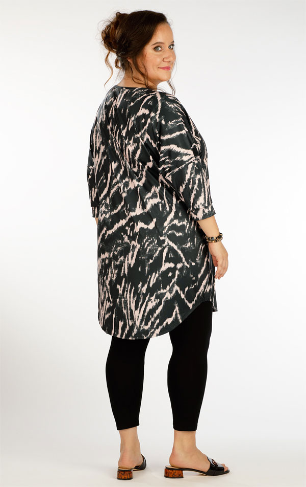 Tunika damska z rękawami 3/4. Luźna tunika z rękawami kimonowymi i głębszym dekoltem w serek. Bardzo przyjemny w dotyku i elastyczny materiał, który się nie gniecie, zapewnia maksymalny komfort noszenia. Oferujemy większe rozmiary. Długość tuniki ok. 95 cm.