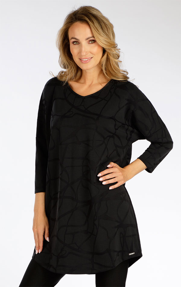 Luźny krój bez kieszeni i dekolt w serek. Elastyczny materiał modal z plastycznymi zdobieniami w kolorze czarnym jest odporny na zagniecenia i nadaje luksusowy wygląd. Długość tuniki ok. 90 cm.