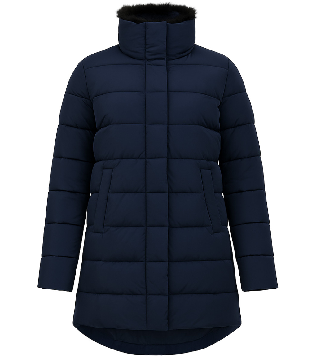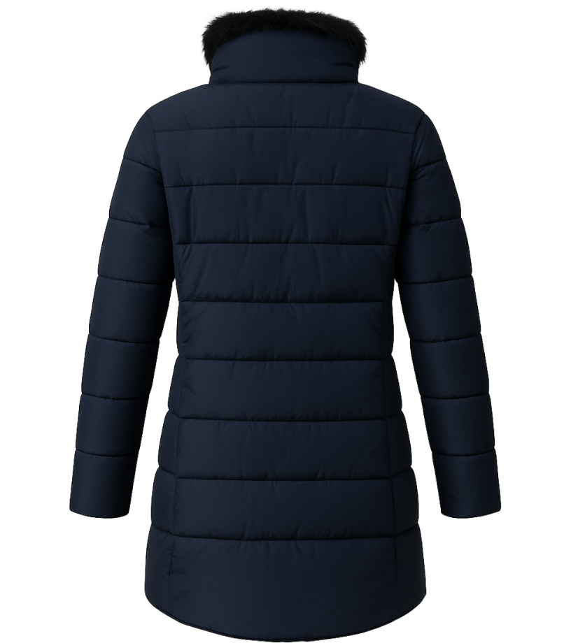 Damska zimowa kurtka pikowana o eleganckim, wydłużonym kroju. Ciepłe ocieplenie i wyższy kołnierz z miękkim futerkiem zapewniają maksymalny komfort termiczny nawet w chłodne dni. Praktyczne kieszenie i prosty krój nadają kurtce ponadczasowy wygląd, który sprawdzi się zarówno na co dzień, jak i w mieście.