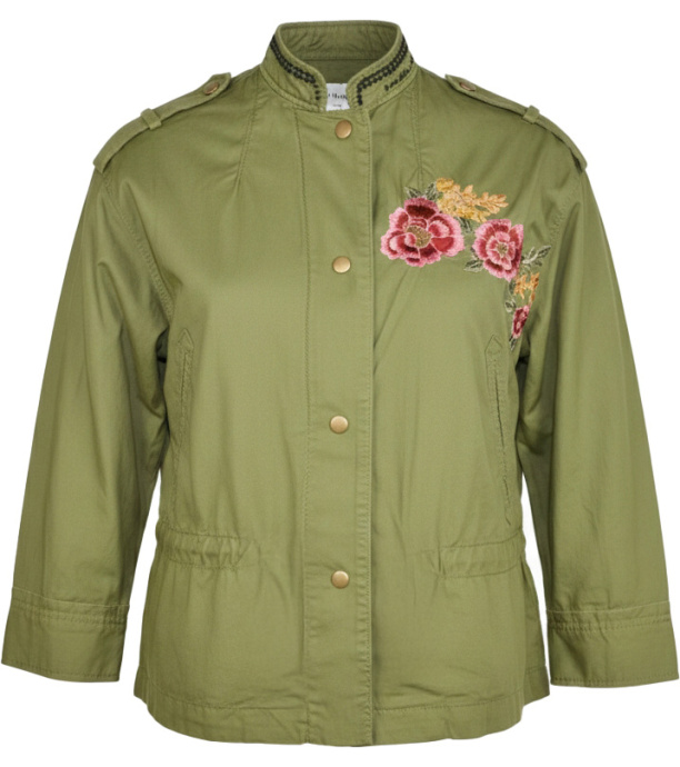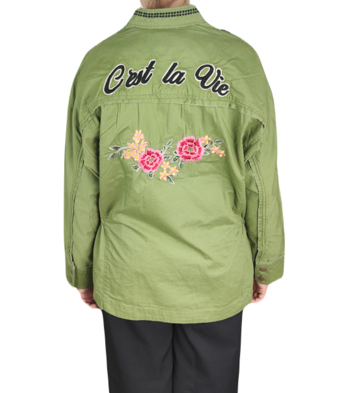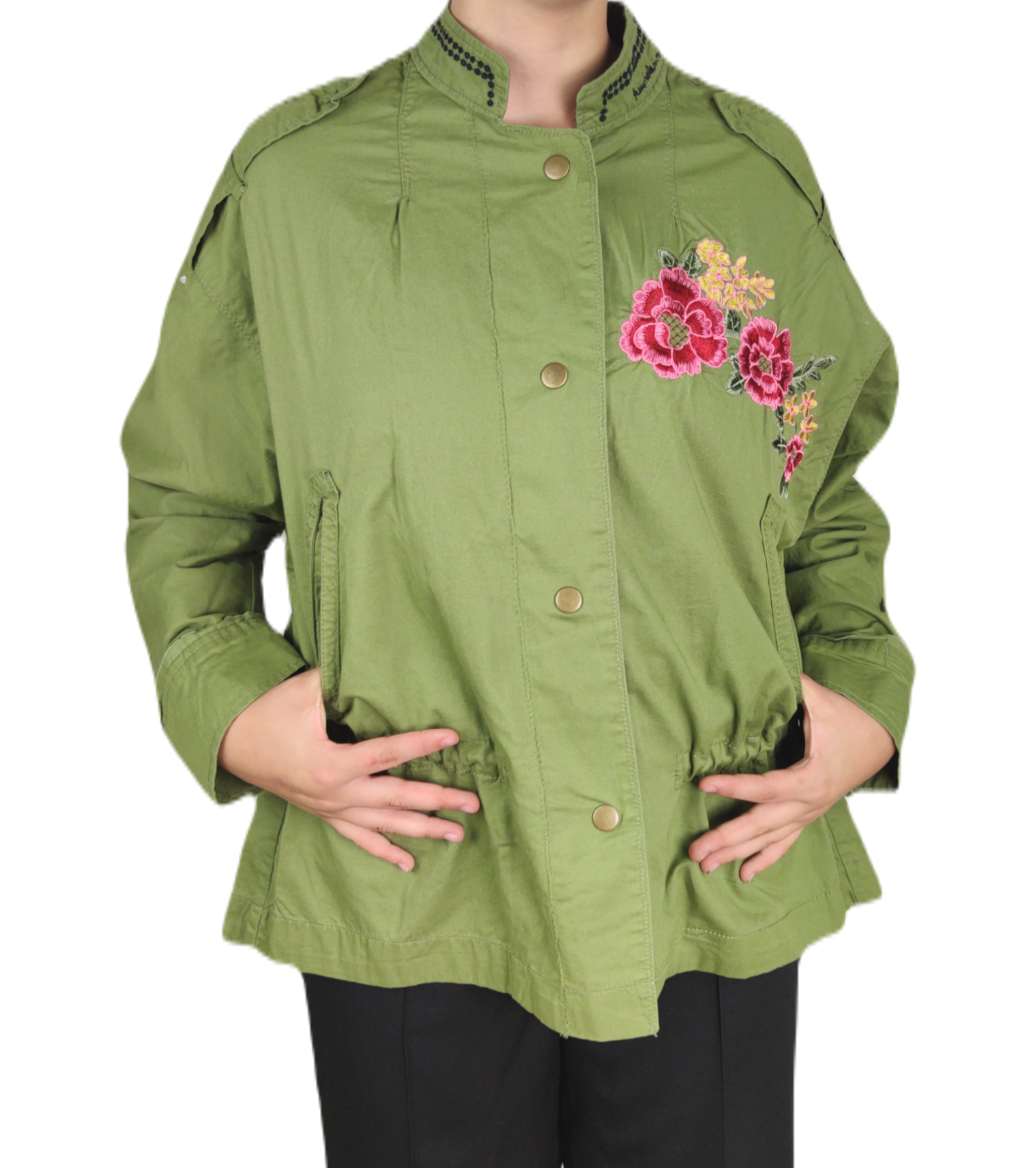 Modna kurtka damska. Zapinanie na zatrzaski. Kołnierzyk ozdobiony haftem i napisem. Na piersi i plecach charakterystyczny kwiatowy haft. Kurtka jest lekko dopasowana.