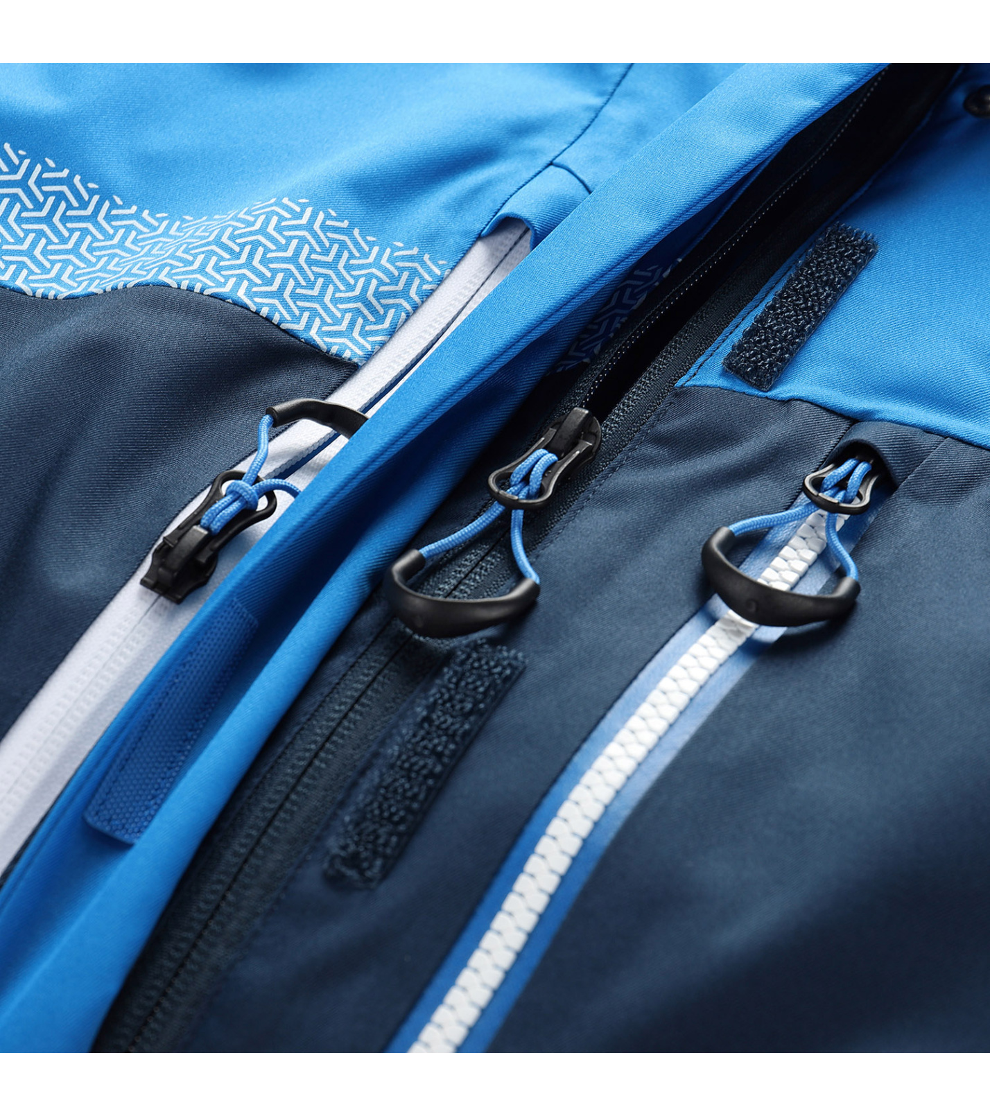 Łącznie 7 kieszeni, klatka piersiowa z wodoodpornym zamkiem błyskawicznym, rękaw z zamkiem błyskawicznym na karnet narciarski, przód z zamkiem błyskawicznym, wnętrze z zamkiem błyskawicznym, wewnętrzna siateczka na gogle narciarskie