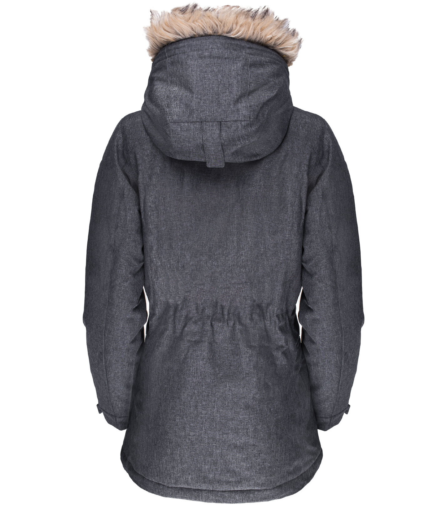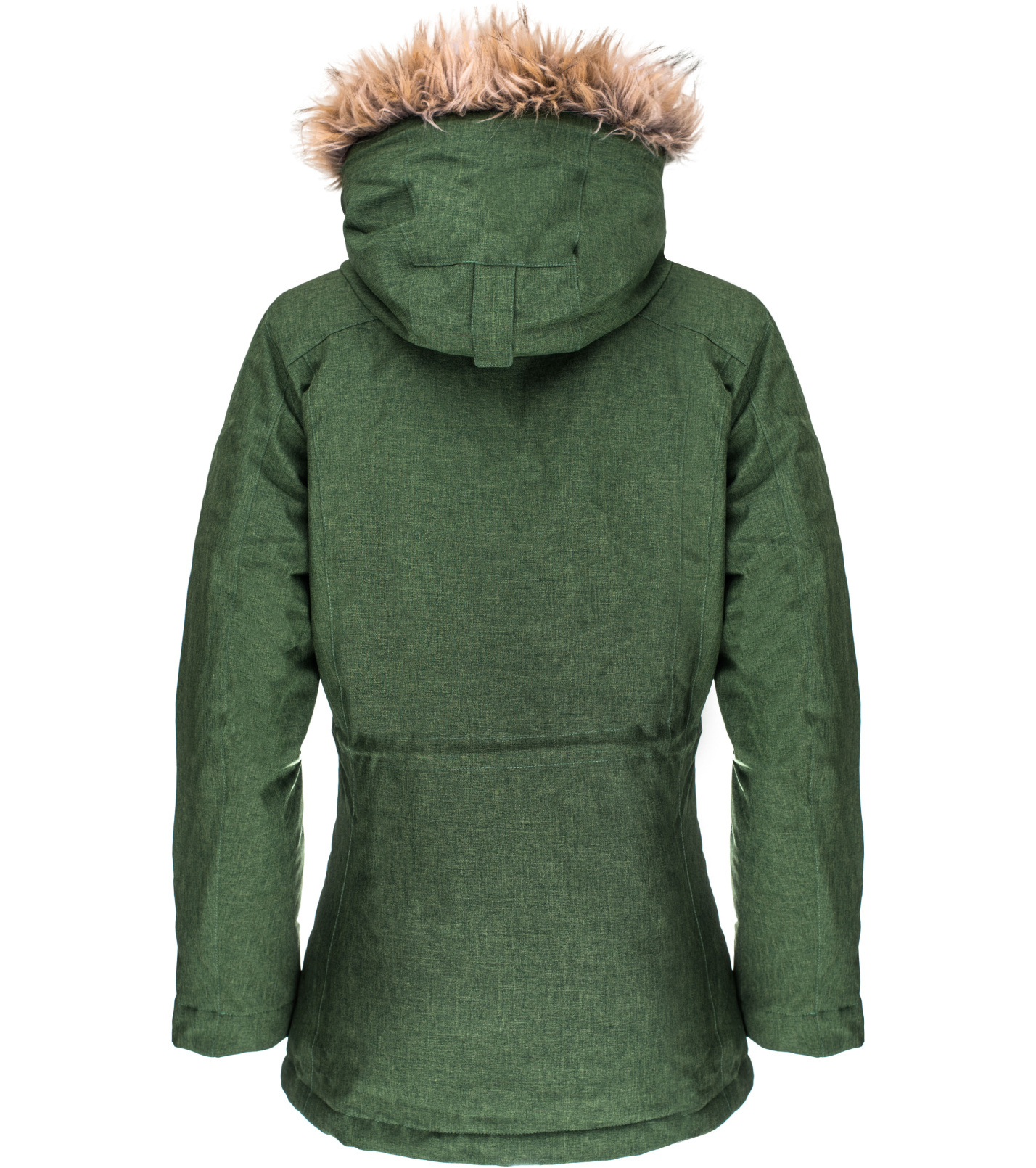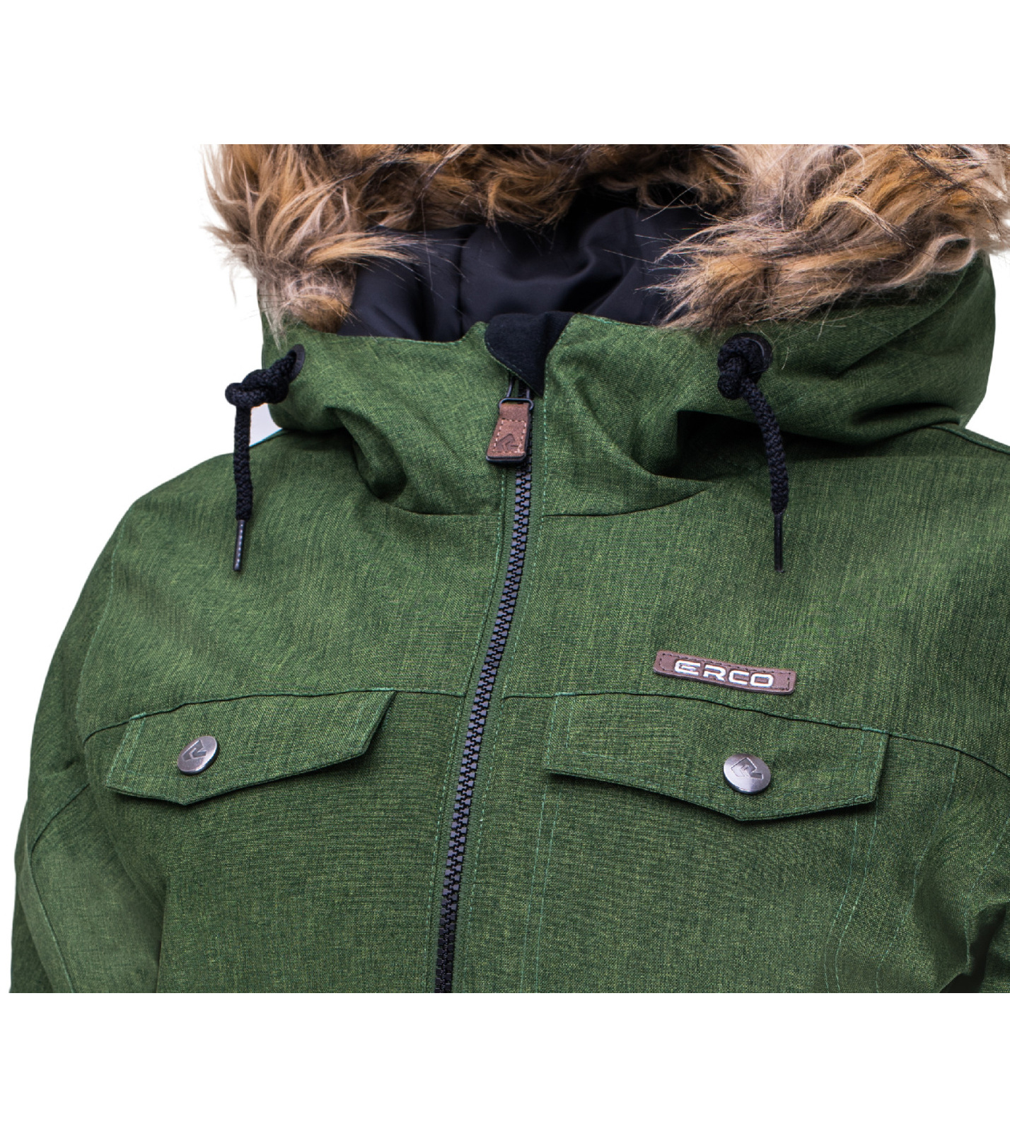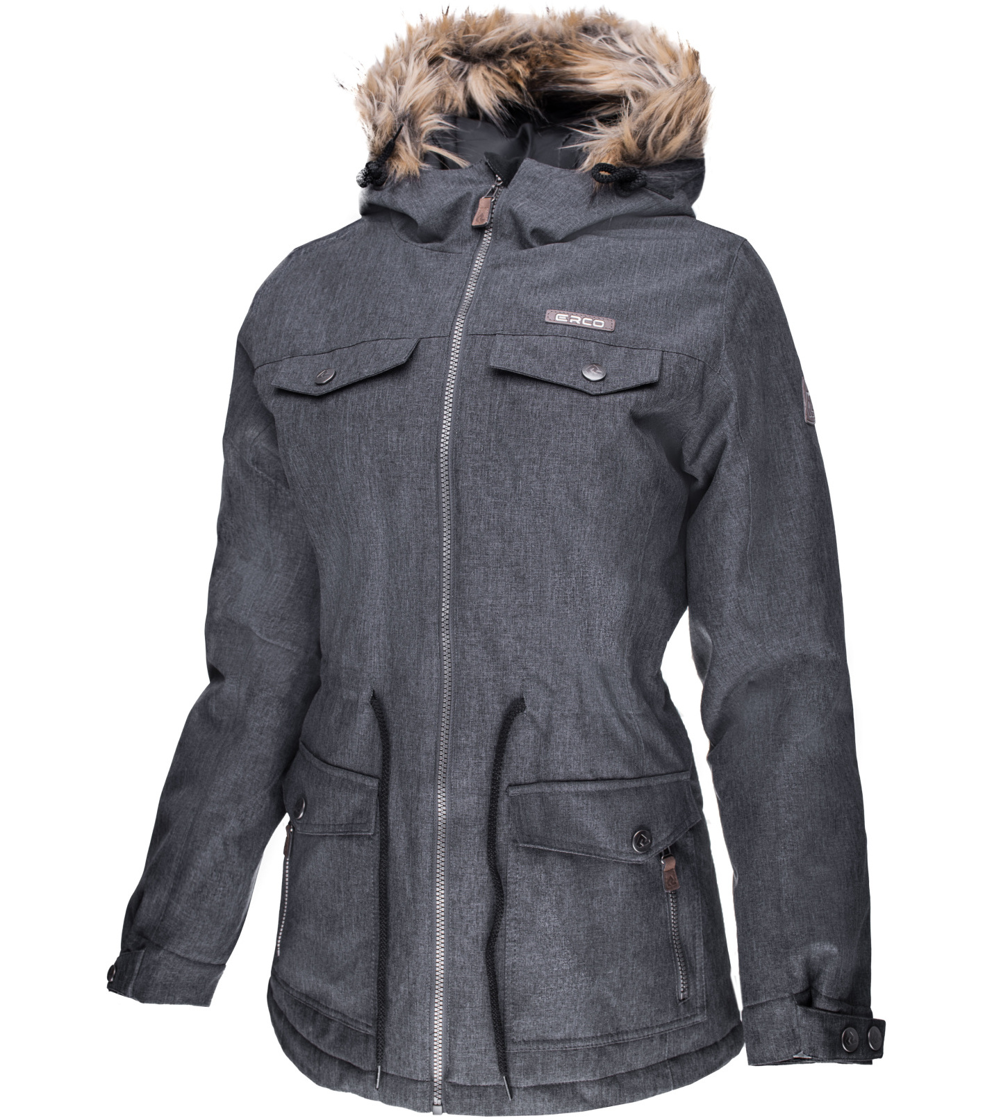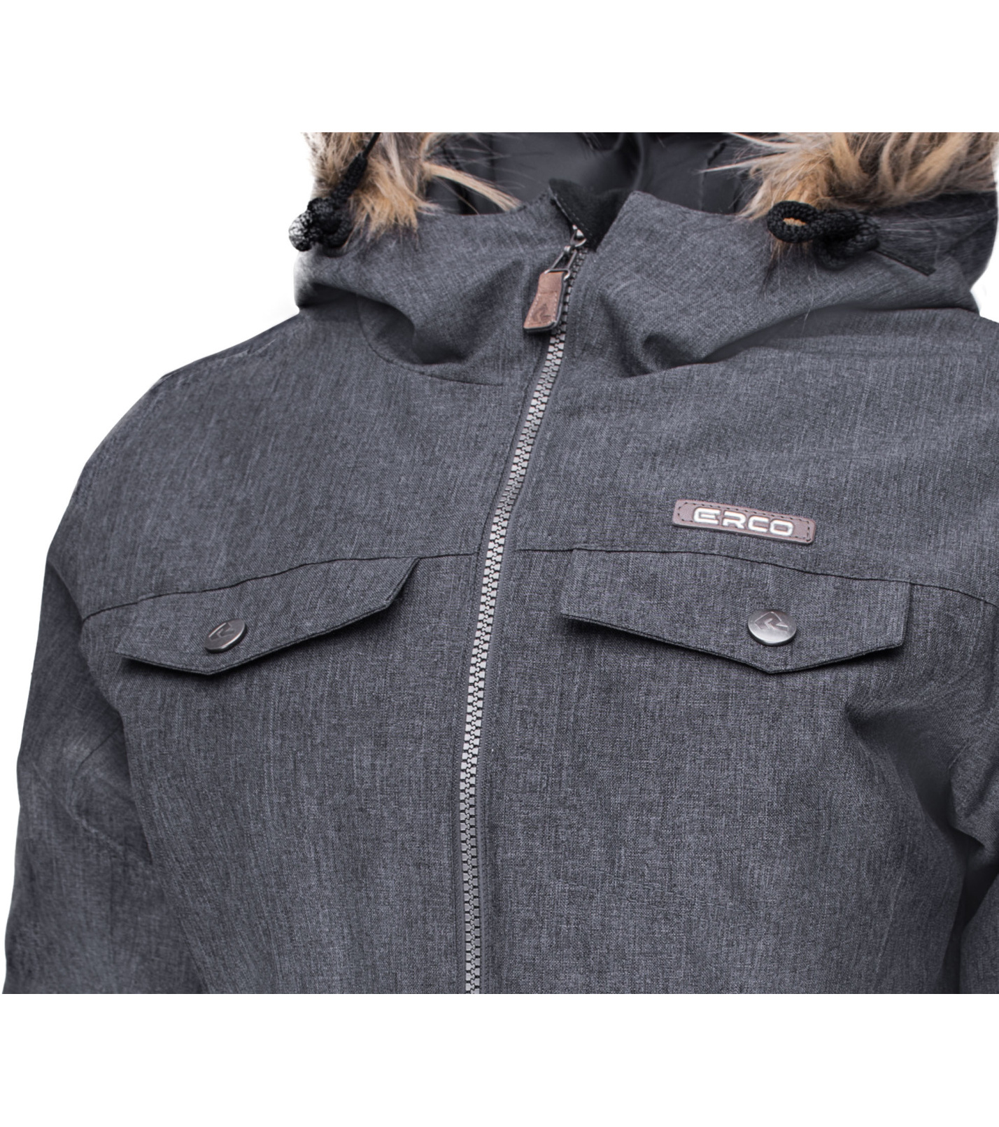 Kurtka zimowa Erco Daronia została wykonana z wysokiej jakości, wodoodpornej dzianiny Performance Oxford 5000. Ciepło zapewnia wypełnienie z wysokiej jakości włókien pustych. Kurtkę dodatkowo zdobi sztuczne futro, które w razie potrzeby można odpiąć. Sam kaptur jest zintegrowany z możliwością regulacji nawisu za pomocą rzepu. Kurtkę można regulować w pasie, a dzięki mankietom również na wysokości rękawów.