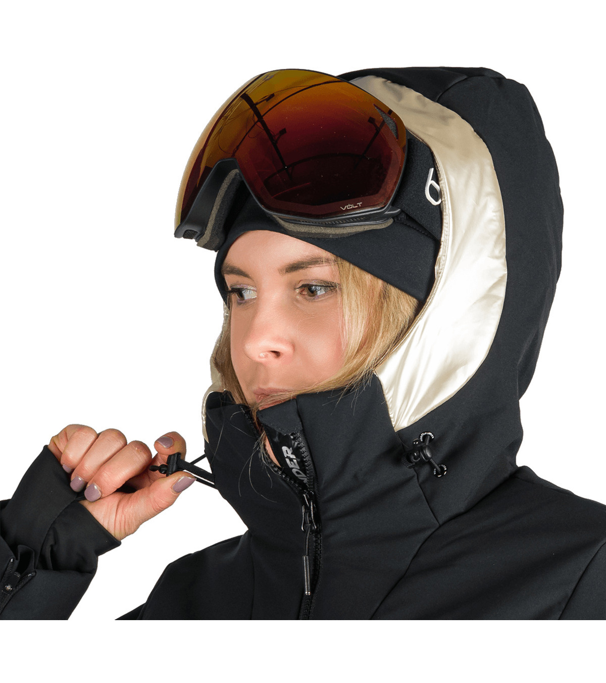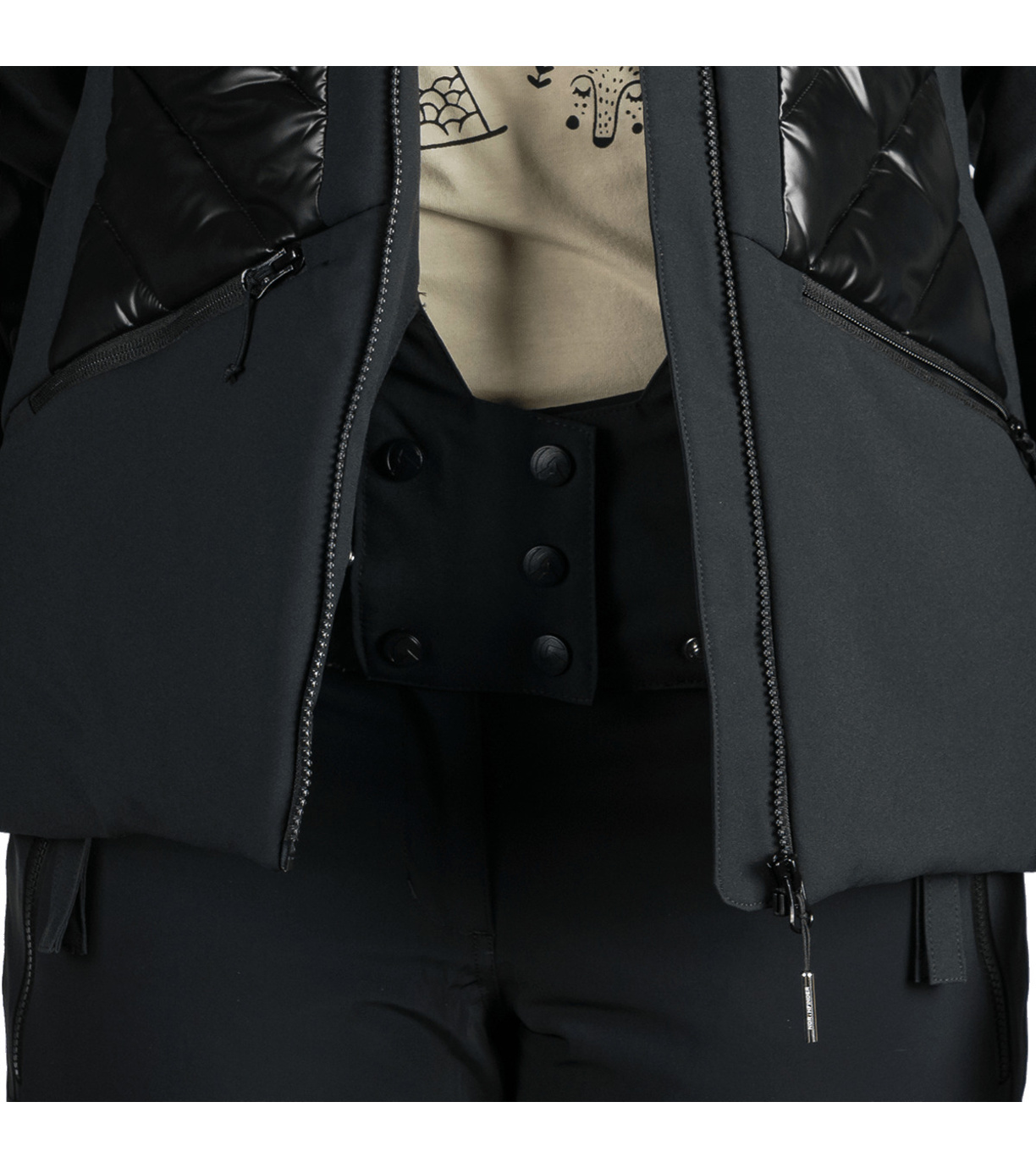 Na trwało wszyty pas ochronny przeciwśnieżny, który zapobiega przedostawaniu się śniegu pod ubranie. Na dole wszyta jest elastyczna guma antypoślizgowa.