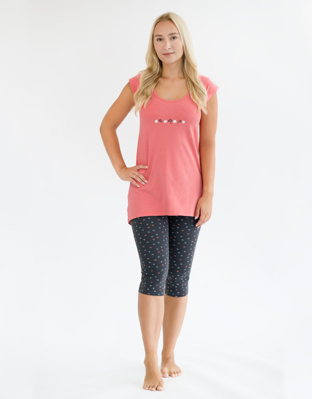 Damska piżama 3/4. Koszulka w kształcie litery "A" z krótkim rękawem i legginsami 3/4, szyta piżama damska. Spodnie mają nadruk. Koszulka jest jednokolorowa z małym obrazkiem. Materiał wykonany jest z bawełny z dodatkiem elastanu. Dzianina jest odpowiednia dla każdego, kto szuka naturalnych materiałów. Elastan dodaje elastyczności materiałowi i poprawia jego zachowanie kształtu. Bielizna wykonana z tego materiału nadaje się do noszenia na co dzień.