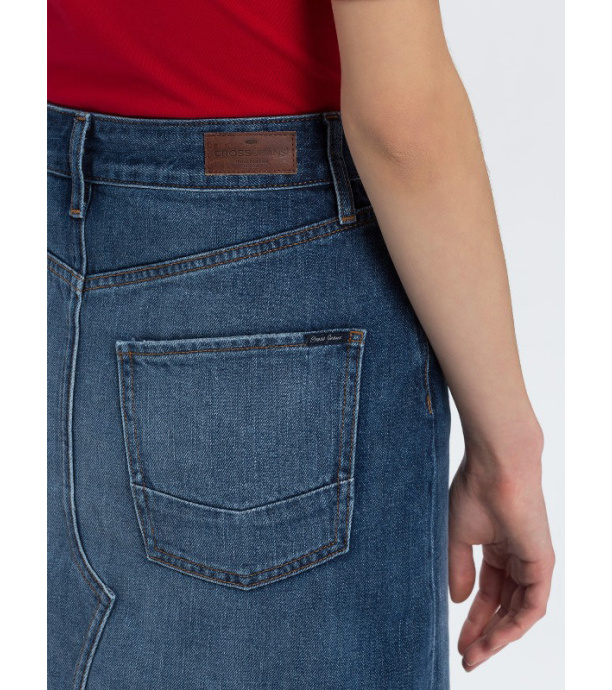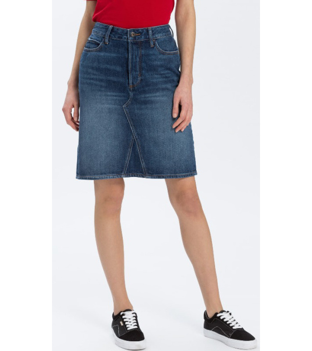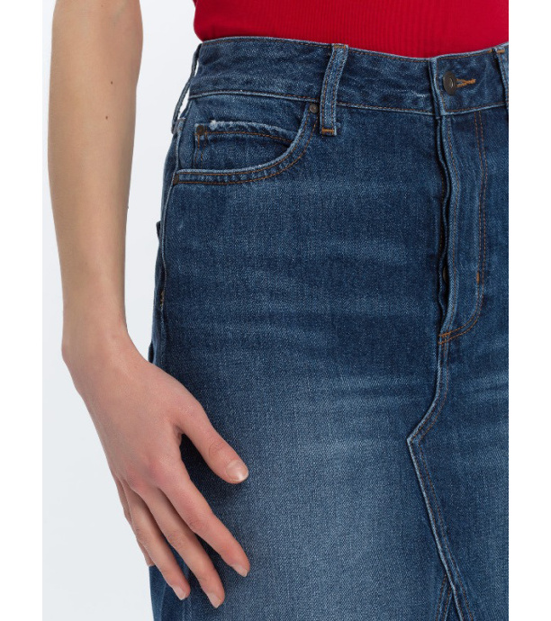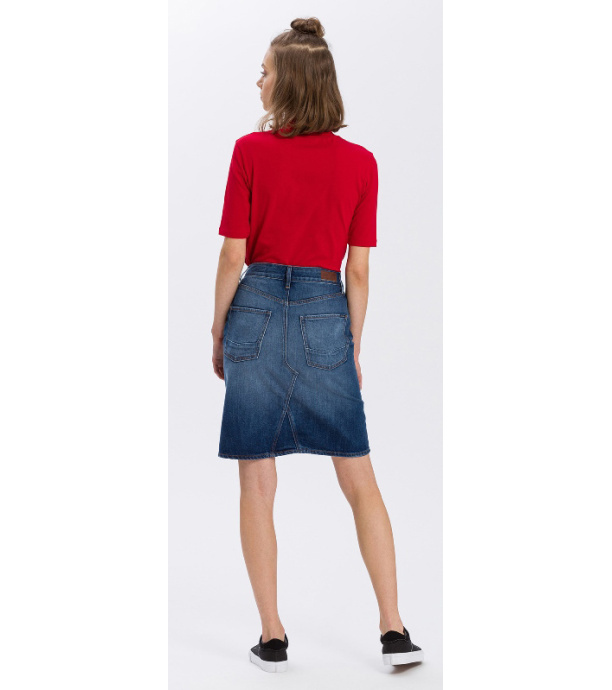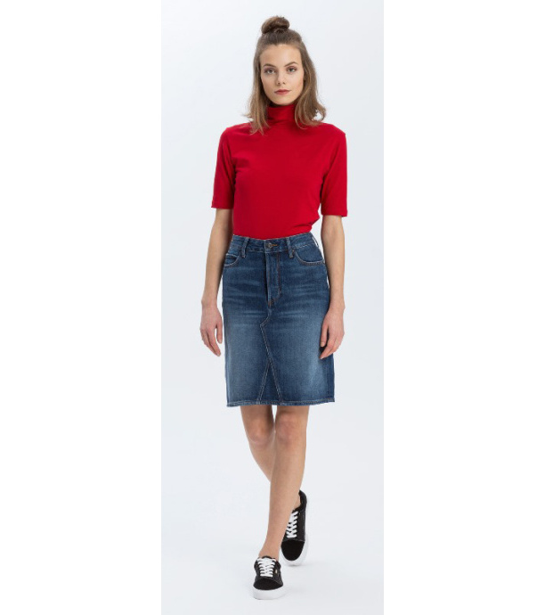 Spódnica jeansowa Ellie o dopasowanym kroju i 5 kieszeniach zachwyci Cię kontrastującymi szwami i szlufkami na pasek. Prosty biały T-shirt i modne trampki to idealne połączenie, jeśli zależy Ci na kobiecej, luźnej stylizacji.