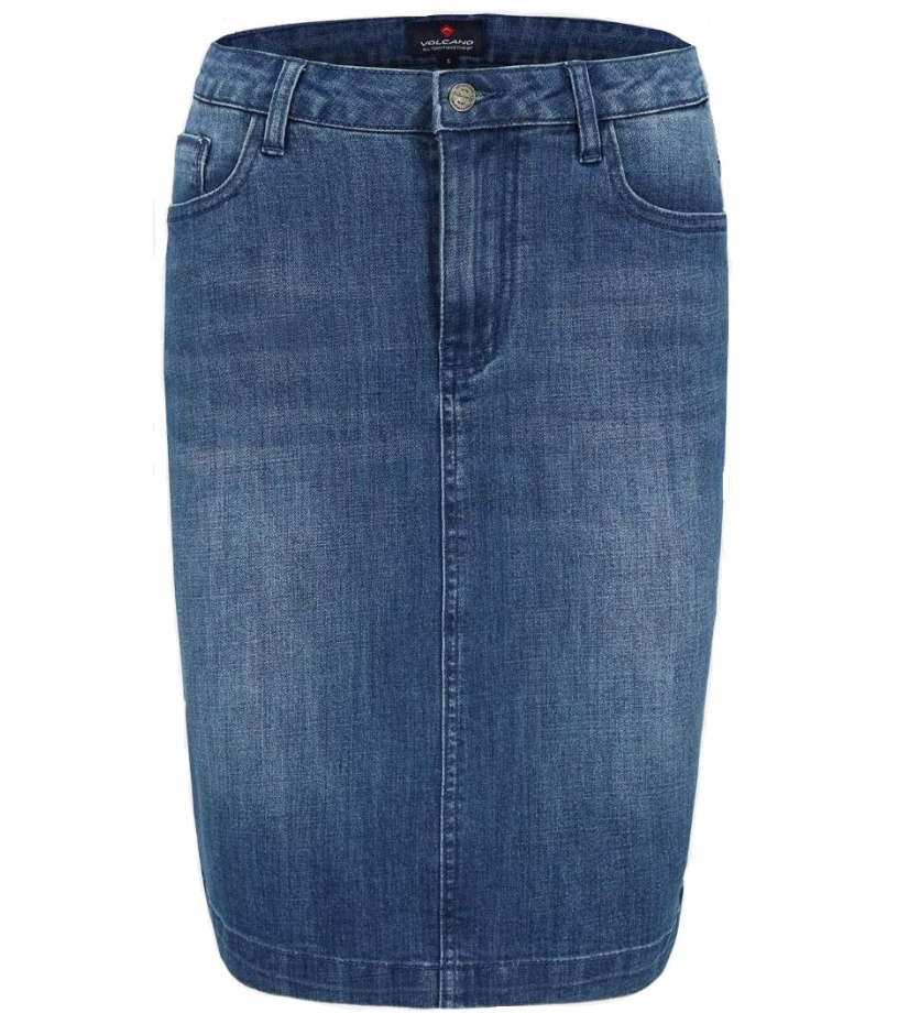Spódnica jeansowa damska Volcano o długości ponad kolano. Spódnica ma dwie kieszenie z przodu i dwie z tyłu.