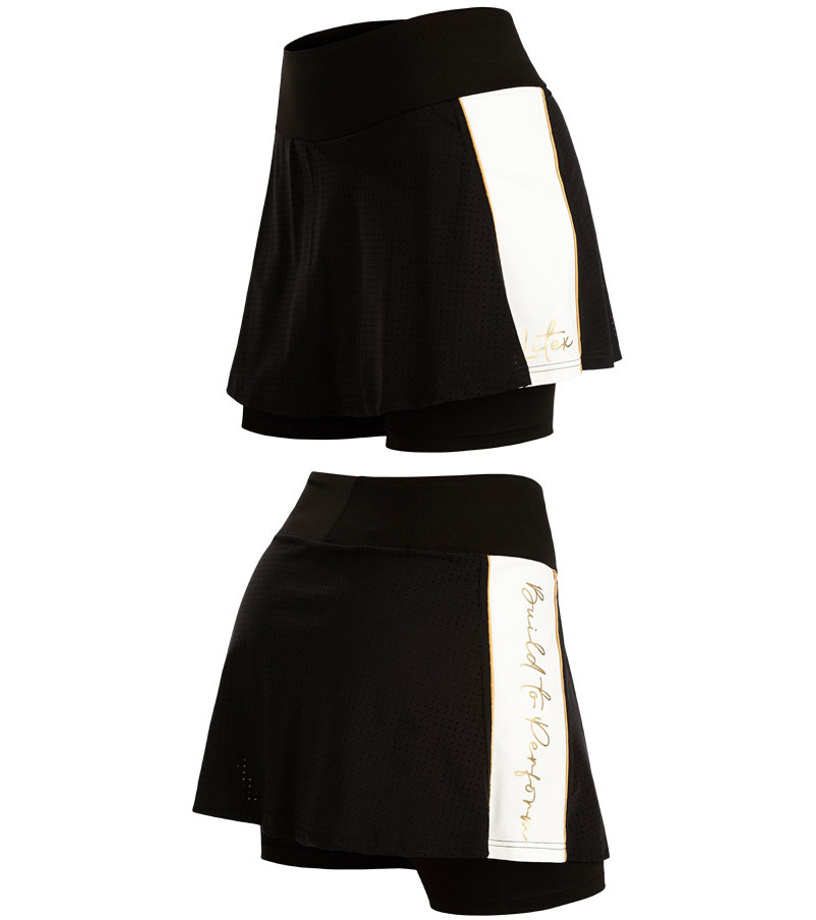 Spódnica z wszytymi spodenkami. Spódnica wykonana z fantazyjnego perforowanego materiału z białymi wstawkami i złotymi detalami. Wygodna, szeroka, elastyczna talia. Materiał jest elastyczny, szybko schnie i zapewnia maksymalny komfort noszenia. Uniwersalne zastosowanie.