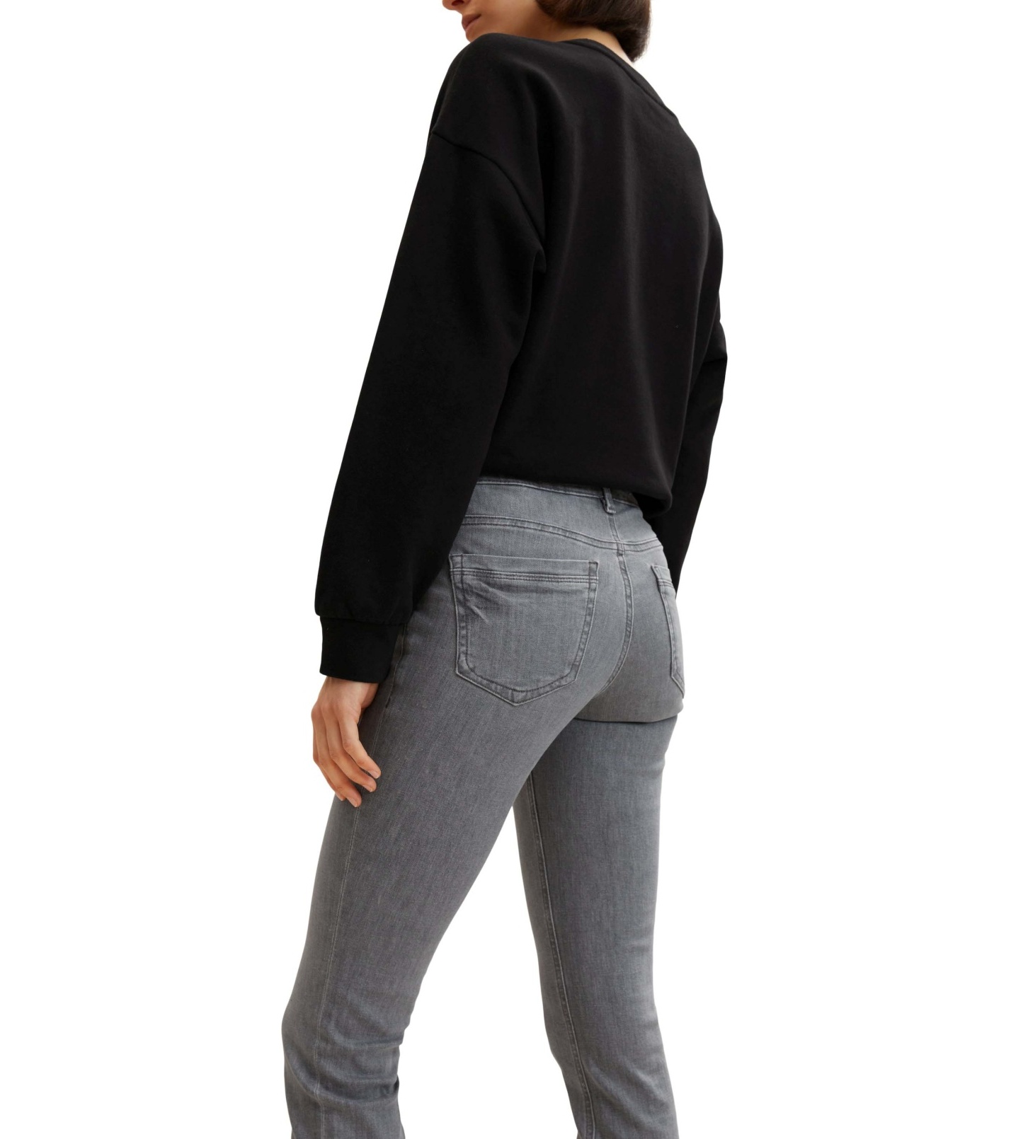 Szare jeansy zapinane na zamek błyskawiczny. Jeansy mają węższy krój, średnią wysokość stanu i węższe nogawki. Markowe jeansy mają dwie klasyczne kieszenie z przodu i dwie z tyłu oraz jedną mniejszą, która jest częścią prawej kieszeni przedniej. Z tyłu spodni naszyta jest skórzana metka z nazwą marki. Spodnie są lekko rozjaśnione w okolicy boków.