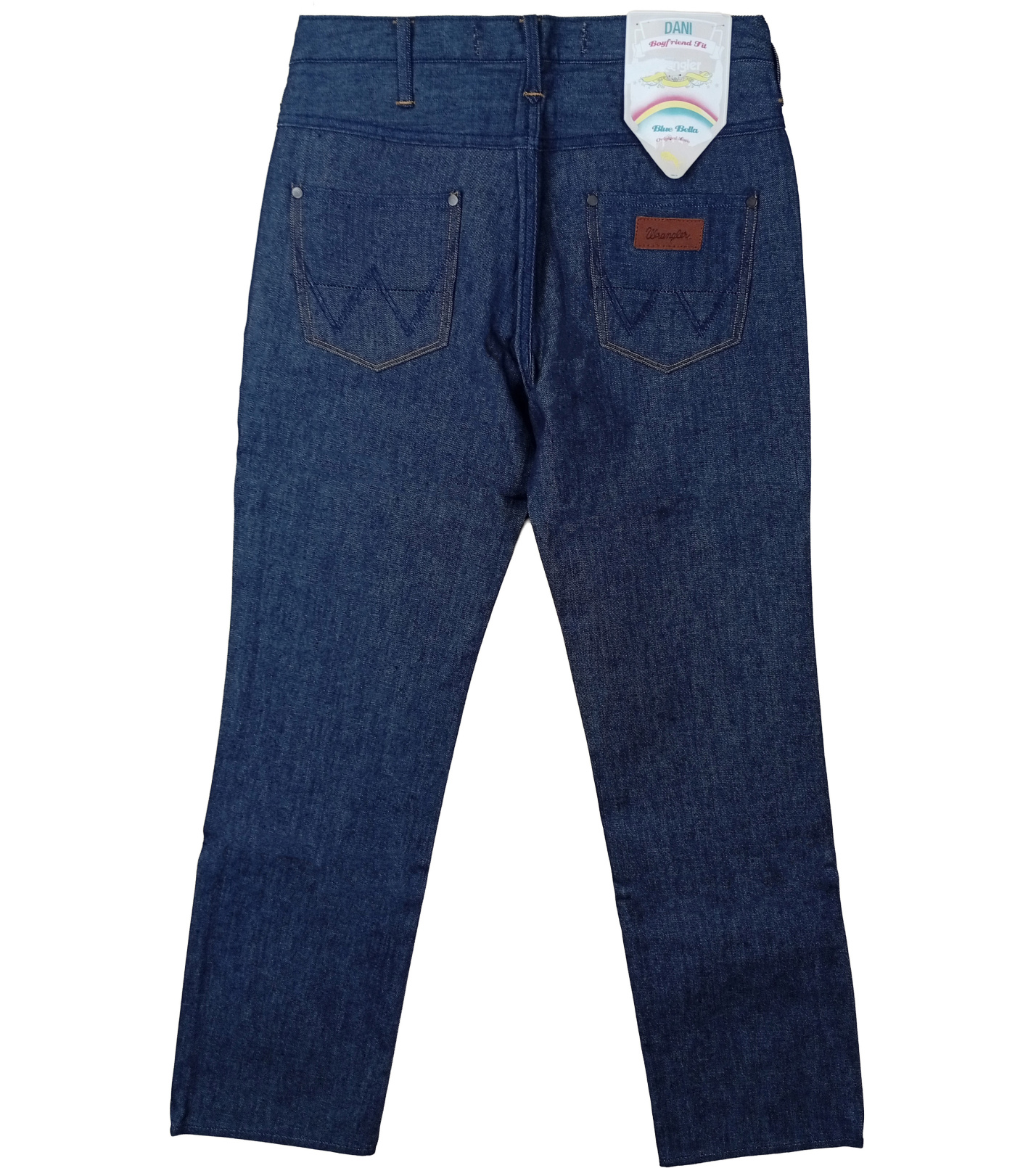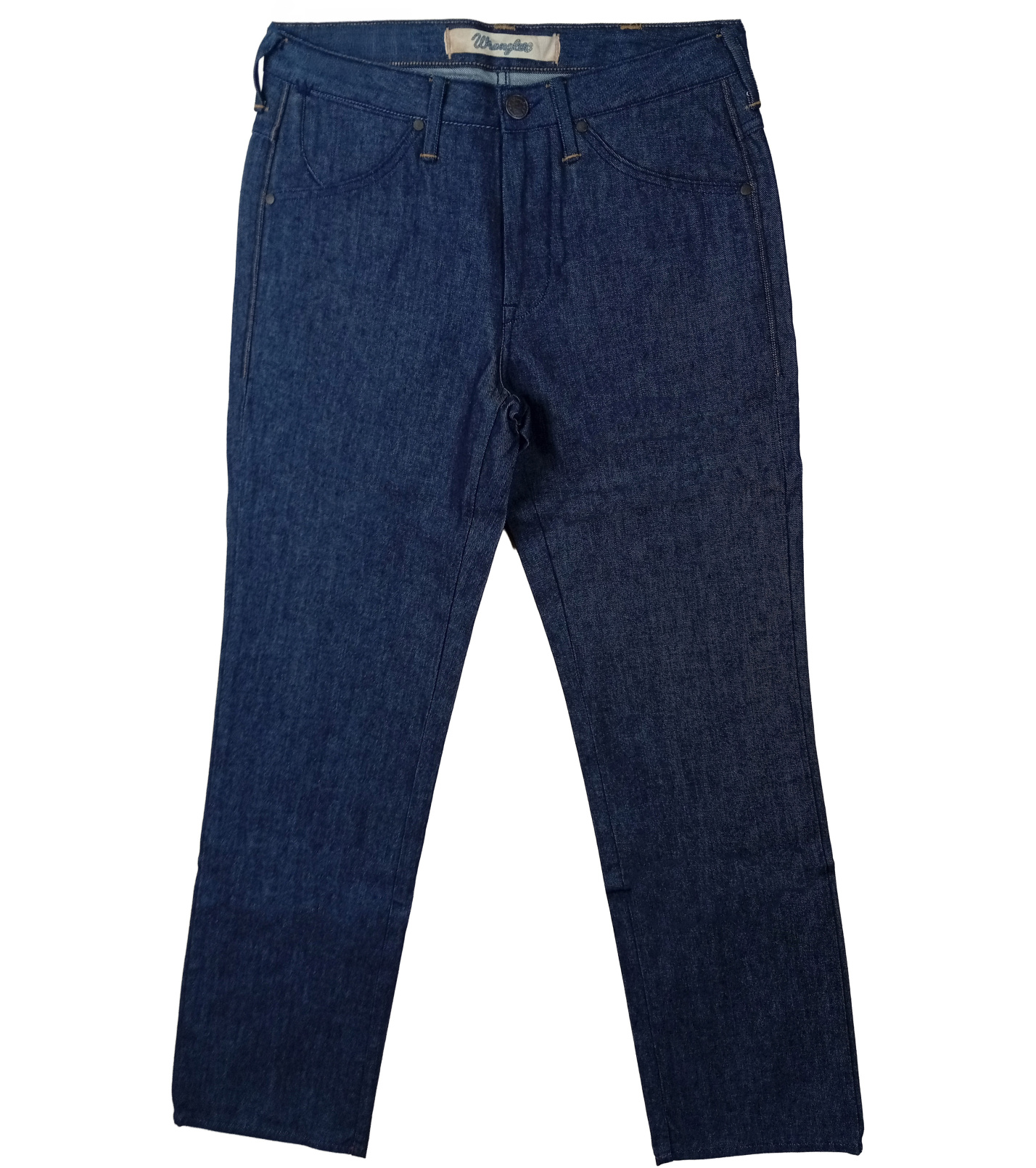 Jeansy mają klasyczne zapięcie na suwak i guzik, kieszenie z przodu, w tym małą kieszonkę na monety, oraz dwie kieszenie z tyłu z kultowym przeszyciem w kształcie litery „W”. Mają również skórzaną metkę Wrangler, która podkreśla ich autentyczny charakter.