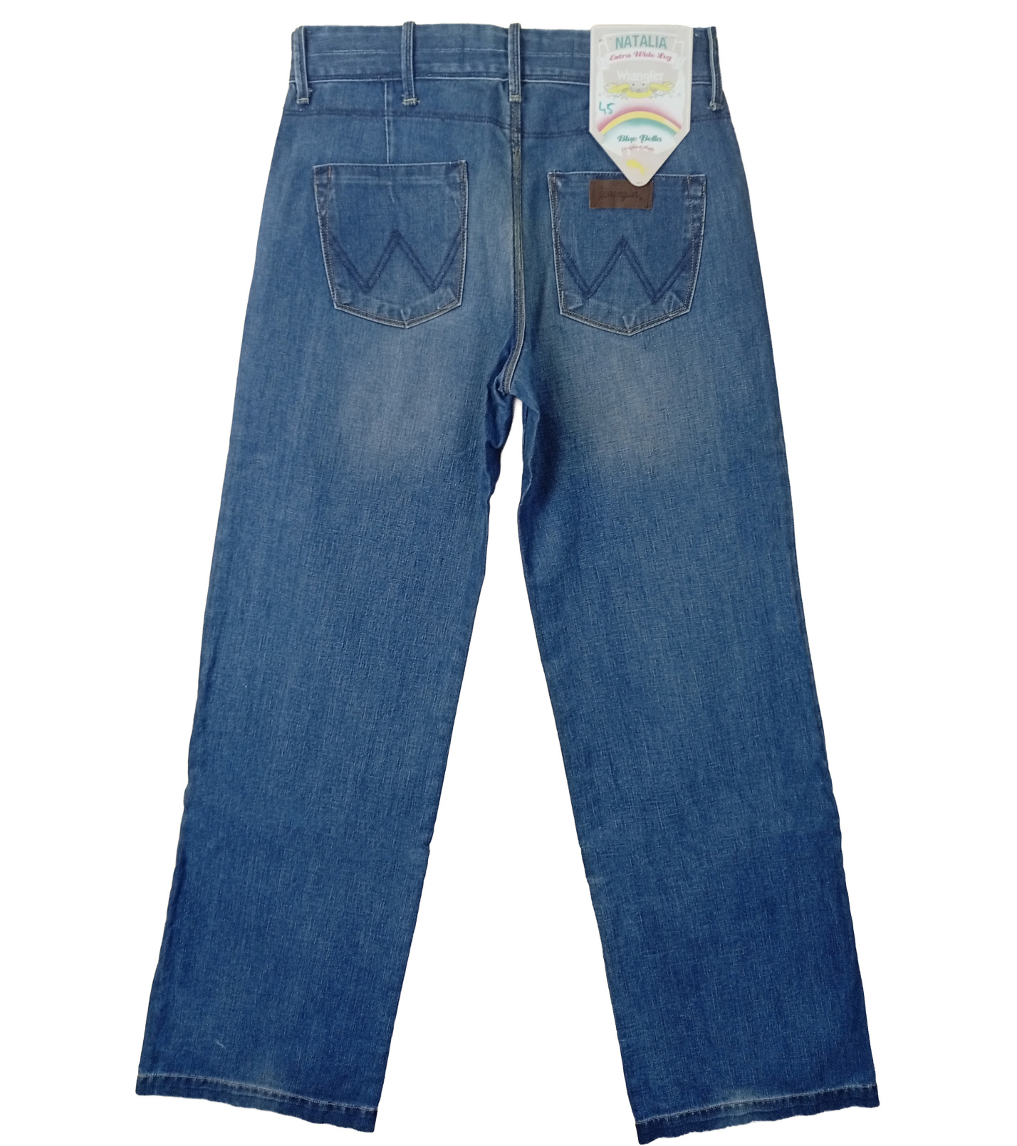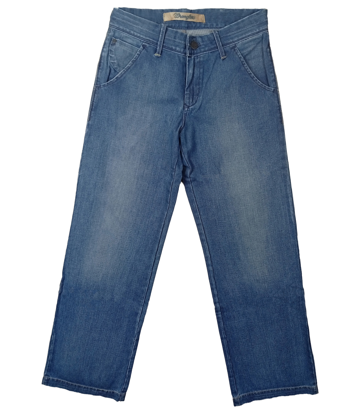 Spodnie zapinane są na zamek błyskawiczny i guzik, mają praktyczne szlufki na pasek oraz klasyczne kieszenie – dwie z przodu i dwie z tyłu z charakterystycznymi przeszyciami w kształcie litery „W”. Na nogawkach znajduje się również kultowa skórzana metka Wrangler, która podkreśla autentyczny charakter marki.