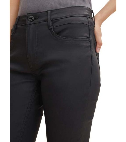 Damskie spodnie ze skóry ekologicznej marki Tom Tailor, zapinane na suwak. Spodnie mają dopasowany krój, średnią wysokość stanu i zwężane nogawki. Jeansy tej marki mają dwie klasyczne kieszenie z przodu i dwie z tyłu, a także jedną mniejszą kieszeń, która jest częścią prawej przedniej kieszeni.